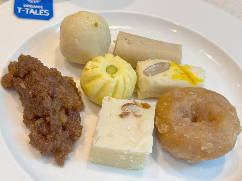 インディラ・ガンジー国際空港にて再びインド伝統菓子で時間をつぶす(๑˃̵ᴗ˂̵)まんまるボール →ガネーシャの好物Coconut Laduから時計回りに、円柱形 →Kaju Roll長方形にナッツのスライス →Mawa Badam Rollドーナッツ形 →Balushahi長方形にナッツ粒々 ... -