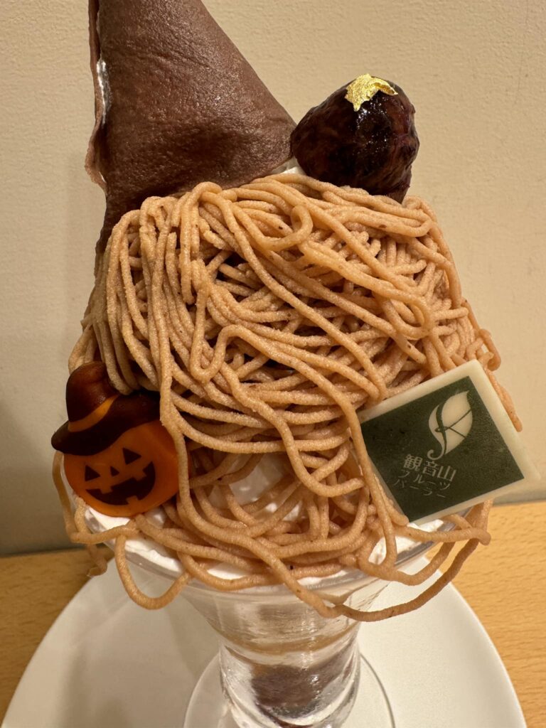 お当番明けは、今秋初のマロンパフェ。金箔のせた渋皮栗にココアクレープの三角帽、フランス産極細モンブランクリームと渋皮栗のアイス、下段のほうじ茶ゼリーのグラス底にも渋皮栗😋渋皮栗は和歌山県産。
