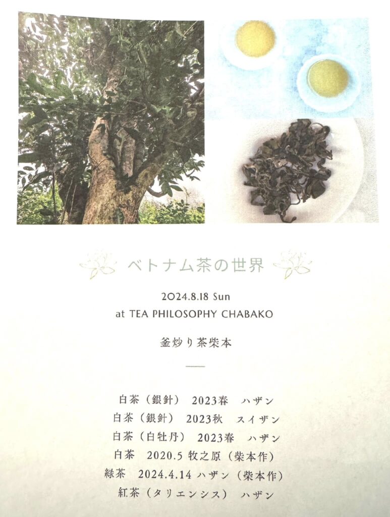 茶師柴本のベトナム茶の世界@Tea Philosophy Chabako 2026 1/28 イベント 世界のお茶を楽しむ会 2026年1月28日 台風一過の暑い中ご参加下さいました皆様、誠にありがとうございました😊たくさんの画像を見ながら、7種類(トレーの6種類+プーアル生散茶)のお茶を2煎ずつ楽しんでいただきました。茶譜と外観は画像の通り。 2024.08.18facebook記事より イベント 世界のお茶を楽しむ会 お茶ガイド よかったらシェアしてね! URLをコピーしました! 安曇野Tea time day 緊急企画 月餅ダージリン中秋茶会 この記事を書いた人 shinowazuri 関連記事 ダージリン87茶園 ダージリンイースト&ウエスト、ティースタ・バレー 2026年1月28日 和のアフタヌーンティー+追茶時間@逗子凜堂 2026年1月28日 世界の紅茶で味覚の旅をする 2026年1月28日 月餅ダージリン中秋茶会 2026年1月28日 村上喫茶時間@九重園 2026年1月28日 老舗冨士美園が継承する茶産業遺産 2026年1月28日 村上喫茶時間@冨士美園 2026年1月28日 村上在来茶園の茶摘み 2026年1月28日