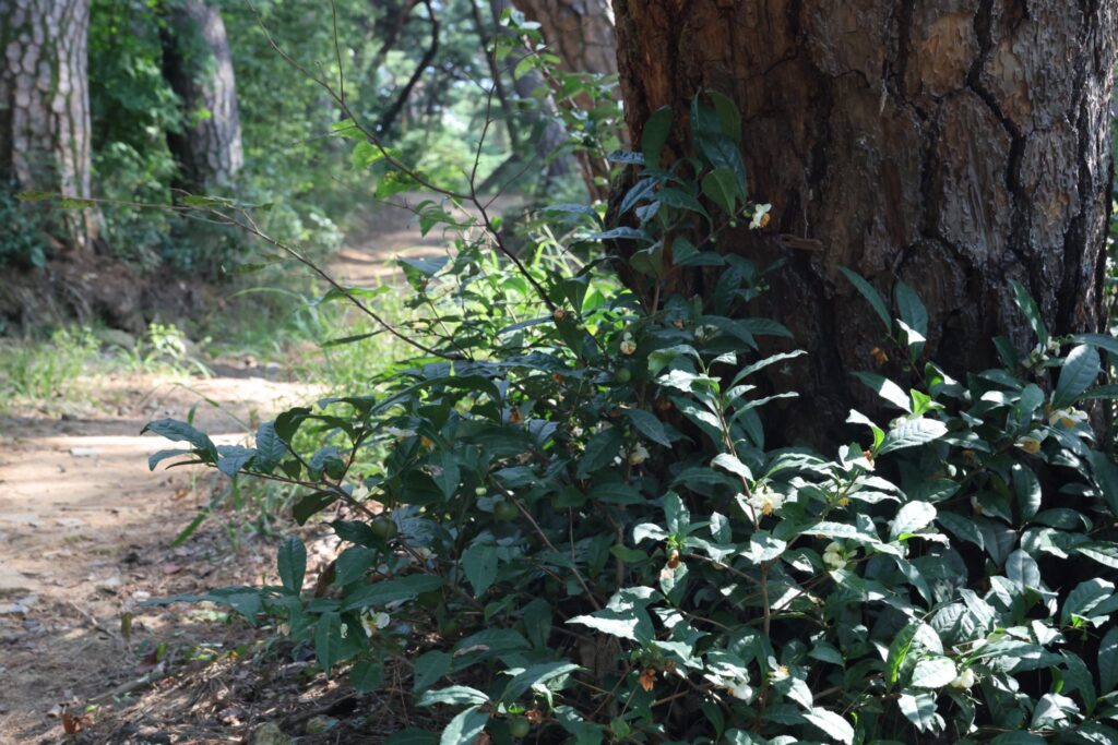 更にその後ろの松林、山道脇に生える木々の木陰にお茶の木が点々と。