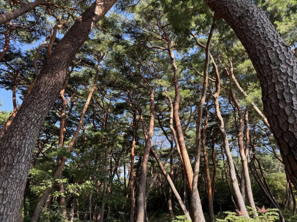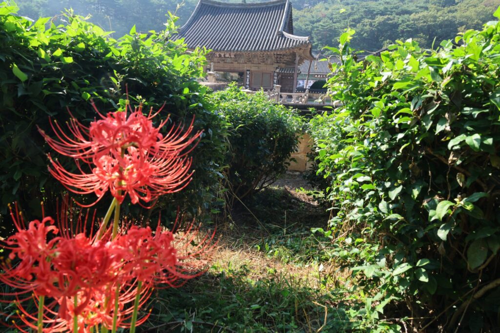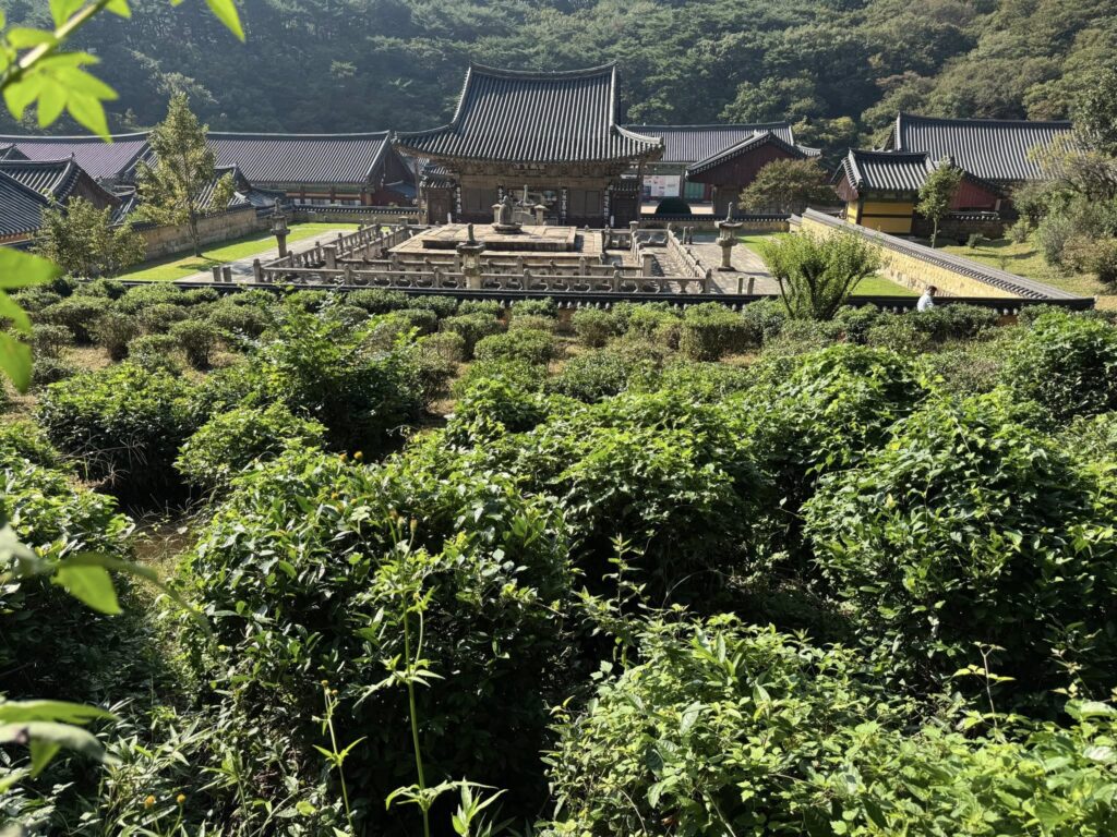 通度寺の中心である大雄殿には仏像が安置されていません。本尊が本来あるべきところには大きなガラス窓が張られ、外の金剛戒壇(慈蔵律師が五台山で授けられた仏舎利が祀られる)を映しています。お釈迦様に祈ることができるので仏像は必要ないということなのです。