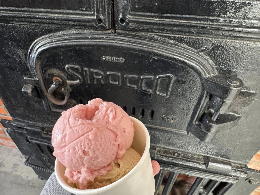 工場見学入り口手前のジェラートスタンドは、看板見て決めて行列に並んだのに、いざケースを見るとティーラテもバニラティーもありません。食べないという選択はないので、ライチ&ローズのソルベとミルクティージェラート。