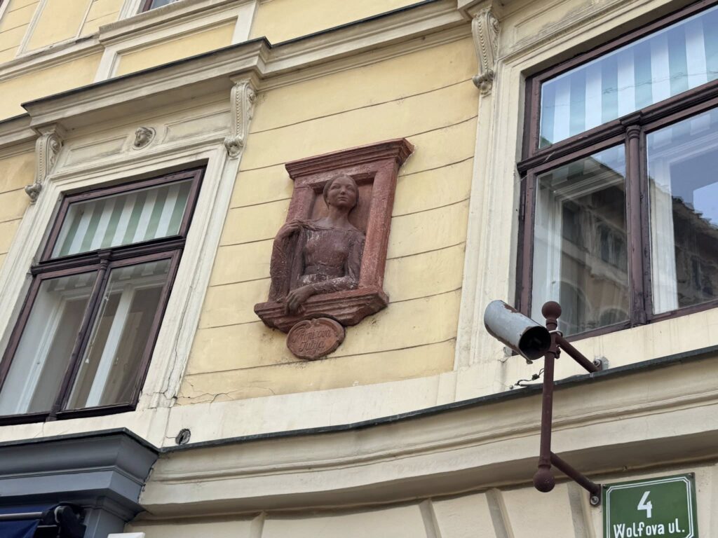 広場の対面の建物の壁面に飾られた女性ユリアのレリーフがあります。ユリアとはプレシェーレンの叶わぬ恋の相手で、隠しているつもりでも街中の人が気づいていました。