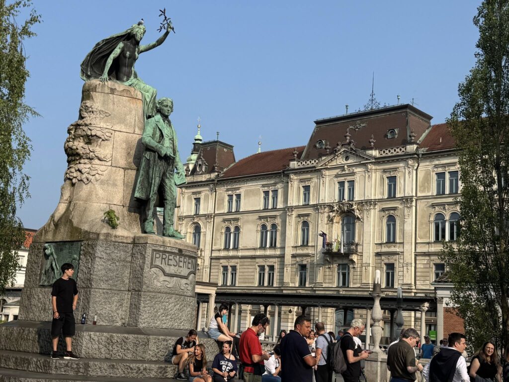 広場に立つ像はスロベニアの詩人フランツェ・プレシェーレンです。代表作『祝杯』の一節は、1989年にスロヴェニアの国歌にもなり、道にも描かれています。