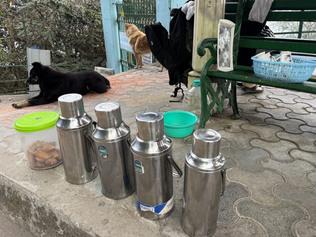 登山学校生徒百人規模人のランニング、屋外スポーツジム(カンチェンジュンガモーニングクラブ)で運動する地元の人たち、そこここでまたりしている犬たちを見ながら朝のお散歩タイムを楽しみました。