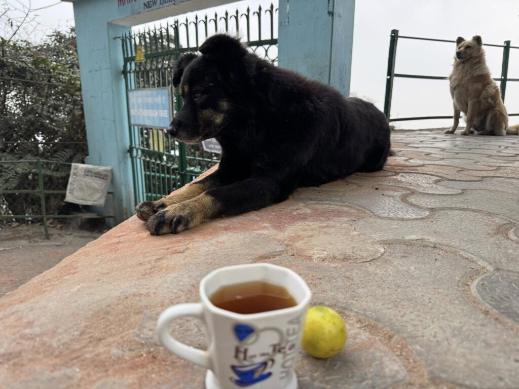 山が見えるまでモーニングティー。謎の塩味を感じる地元のレモンティーを展望台に集う犬たちの向こうで、突然霧の中から穴が空いたかのようにオレンジ色の太陽が浮かびあがりました。