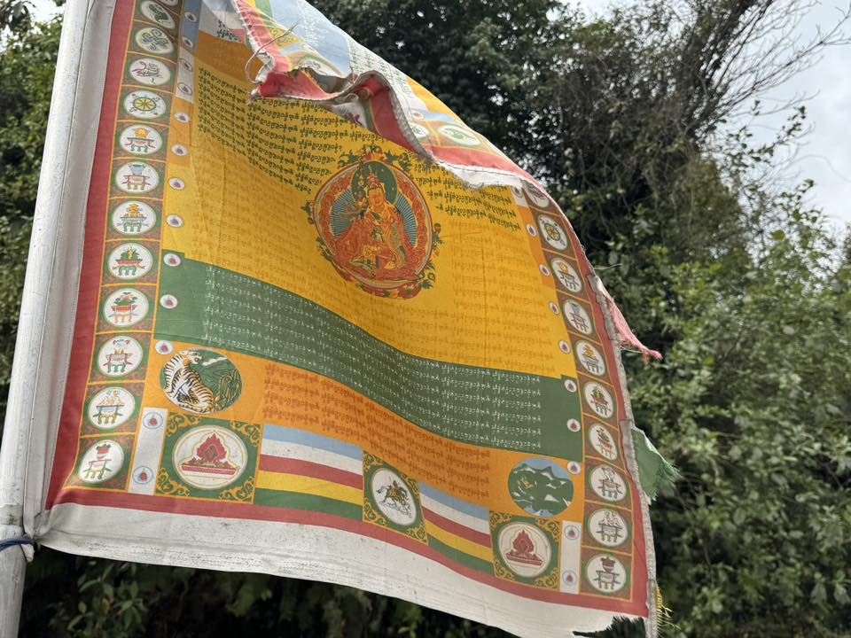 道に立てられたダルシン(経文旗、亡くなった人の極楽浄土と良い転生を願って立て108本立られる白い旗)やルンタ(風の馬、これは自分のために、幸運を願って)は風がはためくたびに、経文を一度唱えたのと同じ功徳があります(マニ車と同じシステムです)。