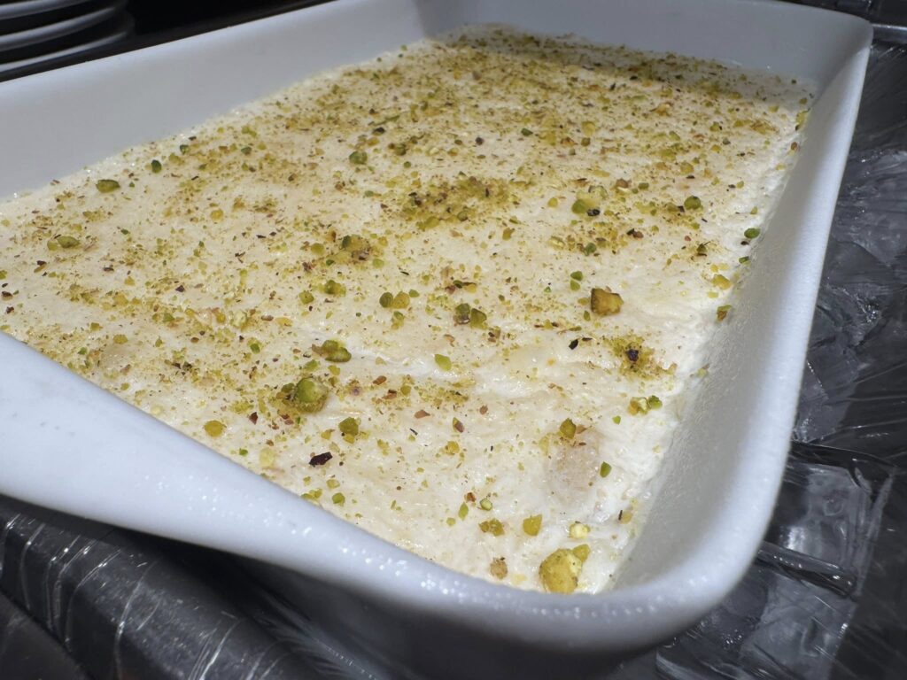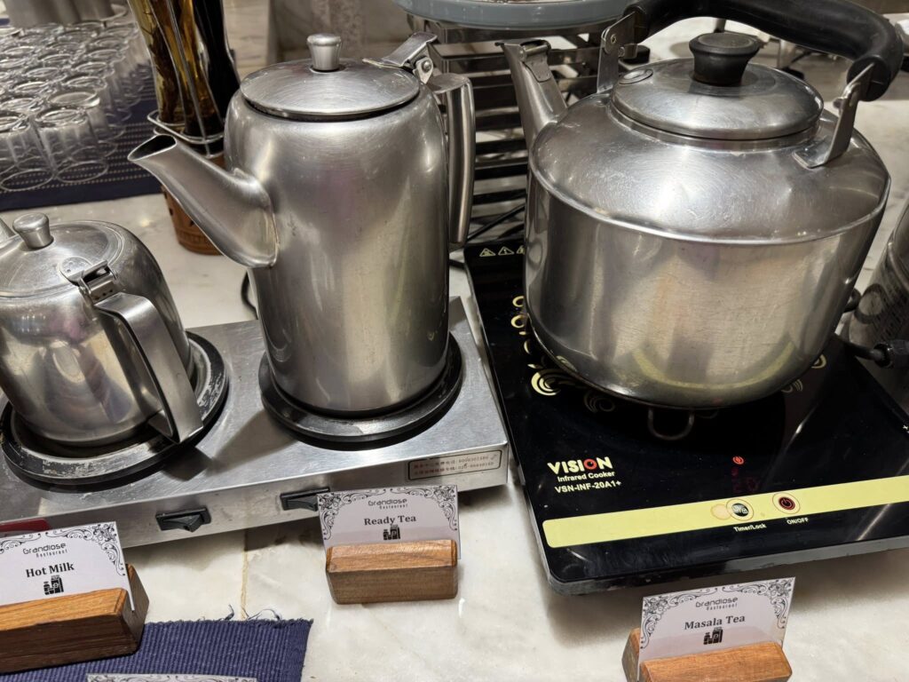 今朝のヤカンに入った熱々のマサラチァイと季節のフルーツとMuesliをのせた定番のドイ(ヨーグルト)に、氷の上に置かれていたペースト状食感のShemai。