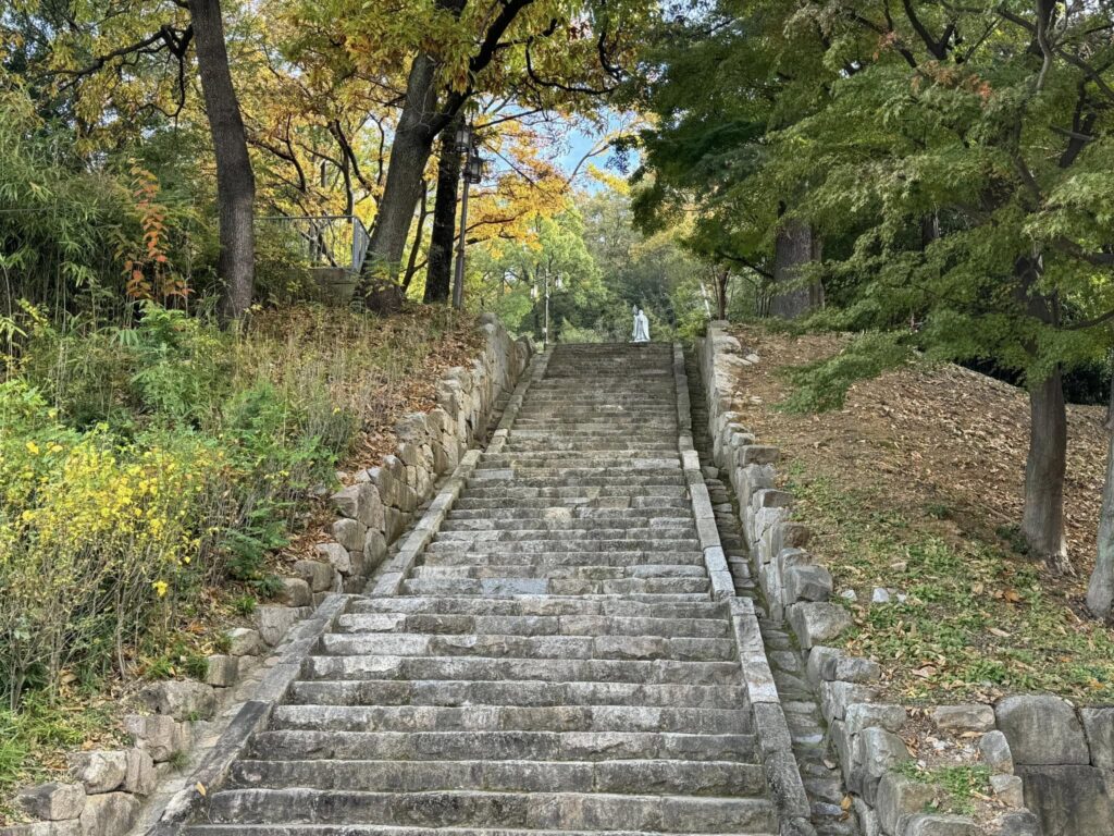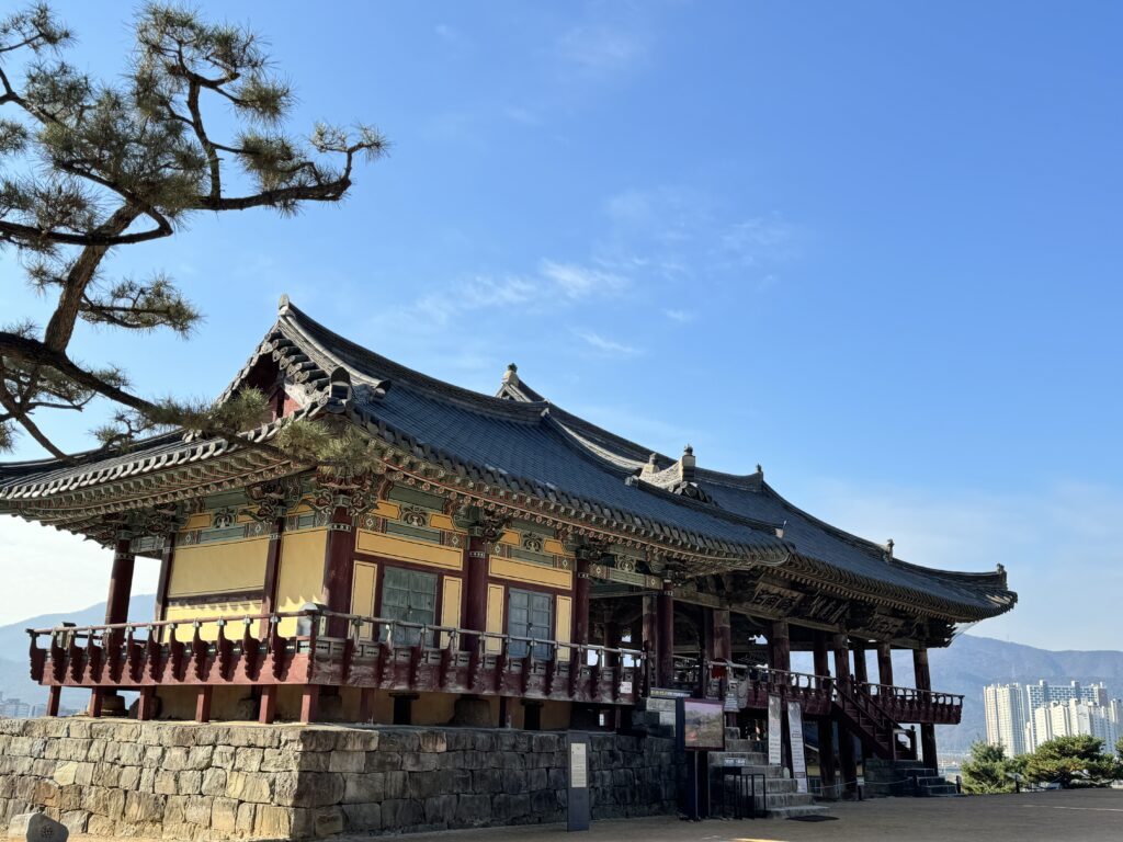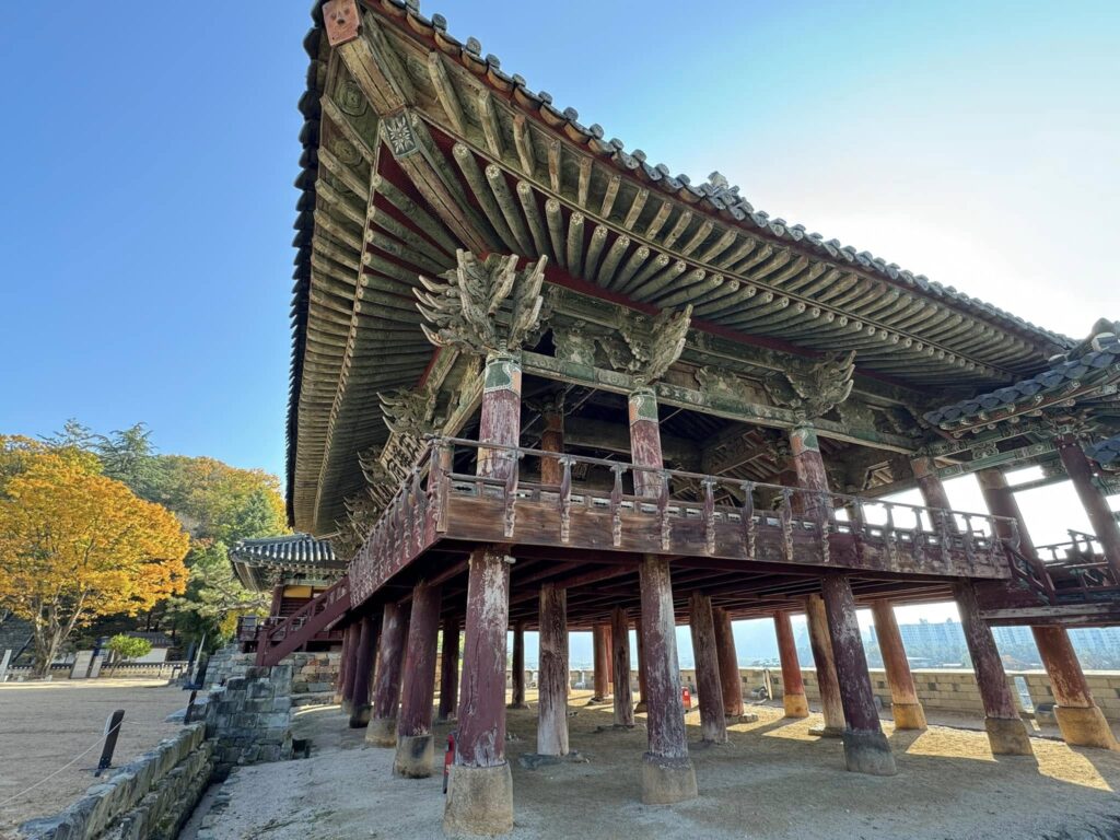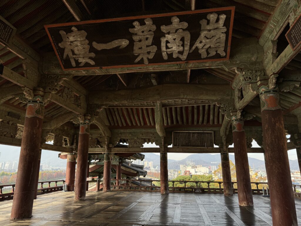 地形に寄り添いながら、高い所から低い所へ水が流れるように、謙虚さの大切さを教えるように建つ楼閣は、中国や漢陽などから訪れる貴人を接待するために、建てられました。楼閣の建築美に魅せられて詠んだ当代の名筆家や文章家の扁額(1000wの肖像となった李滉や綿花を国にもたらした文益漸の扁額もありました)が天井をうめ、一時300も並んでいたと言います。