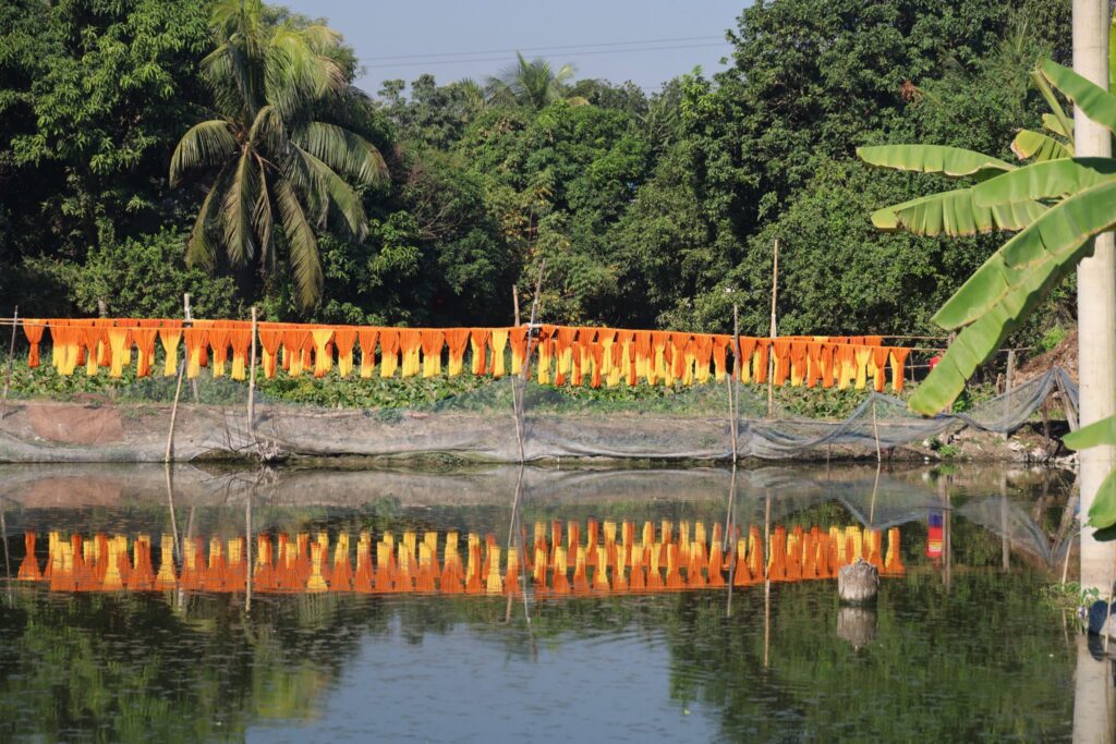 白い糸をマリーゴルドに染める工房に立ち寄ると、リフレクションが美しい池がありました。マリーゴルド色の糸が垂れる畦道を色とりどりの粒々が過ぎゆく風景がありました。