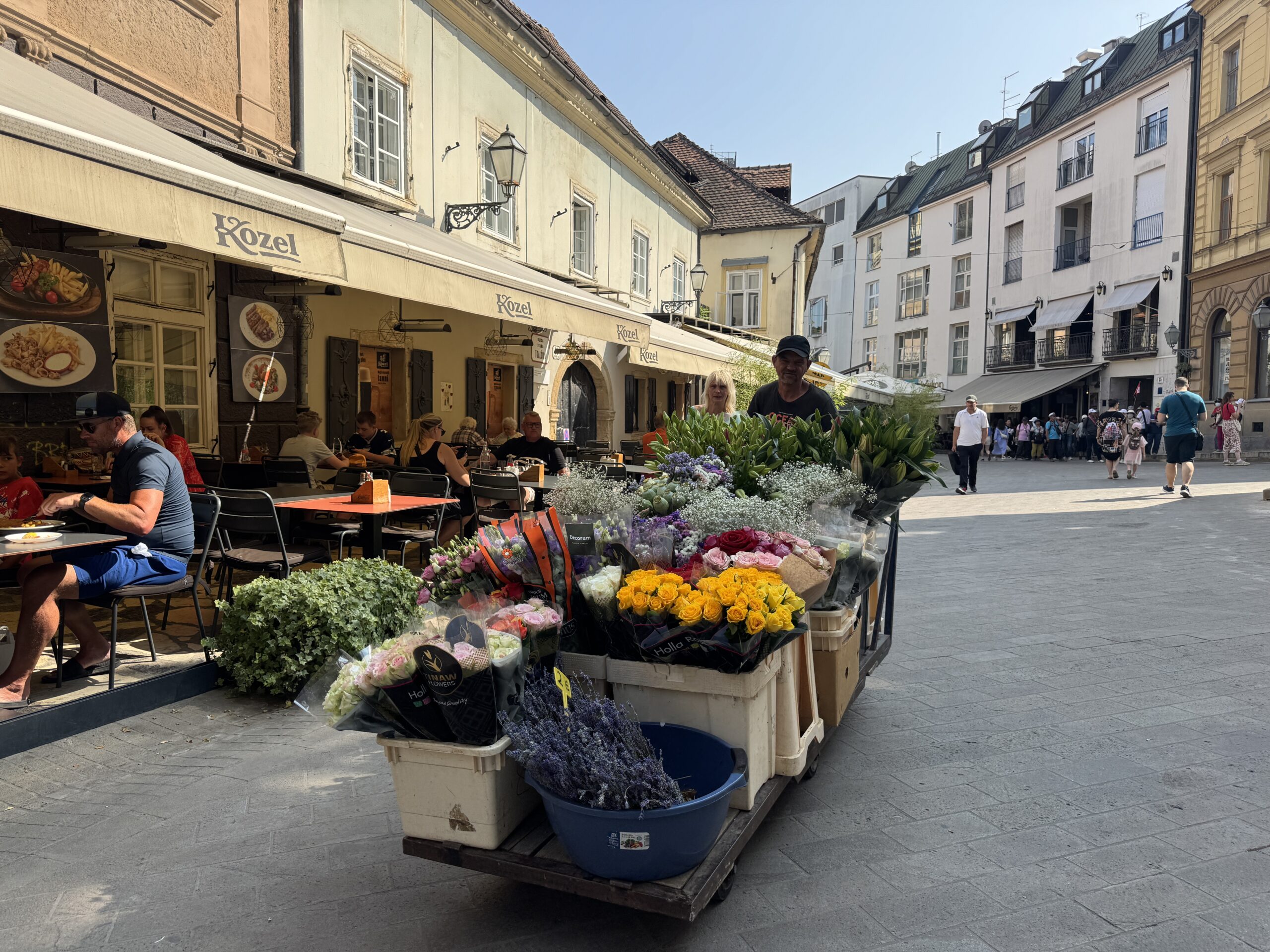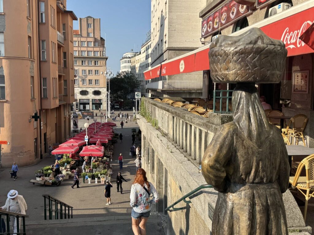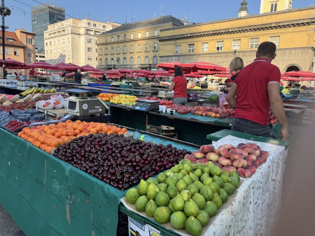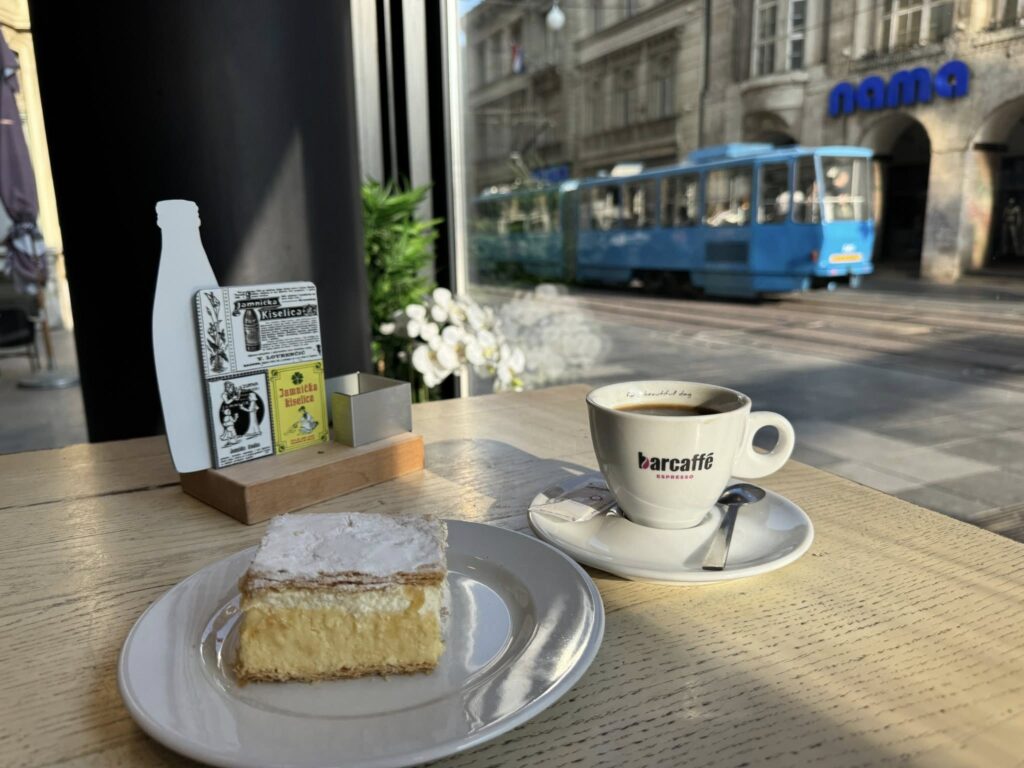 朝7時からオープンするザグレブの台所と言われる青空市場(ドラツ市場)を待ちながら、空色のトラムが行き交うカフェにて、ザグレブ定番スイーツクレームシュニッタと、本当は紅茶が良かったのだけど、ないので、困った時のアメリカーノ🥹