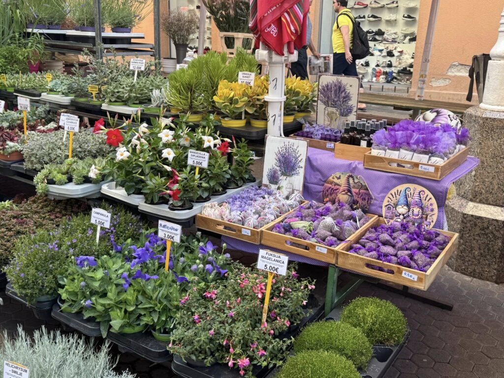 市場は、大ざっぱに生花(階段前)・青果(露天)・生肉(屋内)に分かれています。ドライフルーツ&ナッツ系売り場に求めるチュルチヘラを見つけられるかなと思うも見当たらず、菩提樹のハチミツ(4€)のみ購入しました。