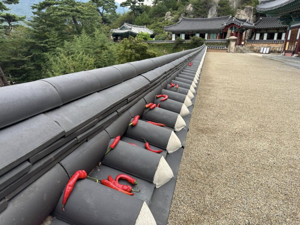 28あるお寺の中で開山の慈蔵律師の名前を冠した慈蔵庵では、黒い瓦の上に天日干中の唐辛子が色鮮やかでした🌶️