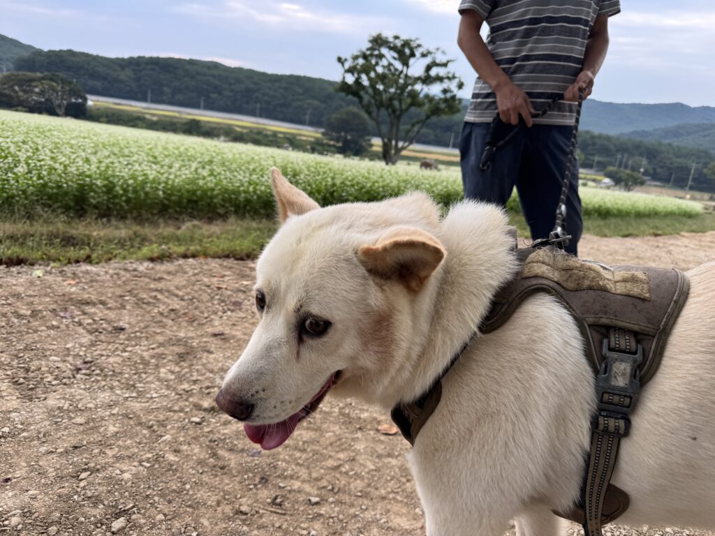 今朝は朝食をパスして、蕎麦の花咲く場所へむかう。新たな観光スポットとして有名になりつつあるようで、地元の人々だけでなく観光誘致にもなっているらしい。白い花の中から白犬が出て来たと思ったら、豊山犬(プンサンゲ)でした^_^