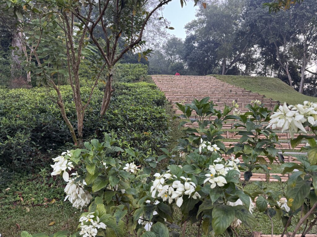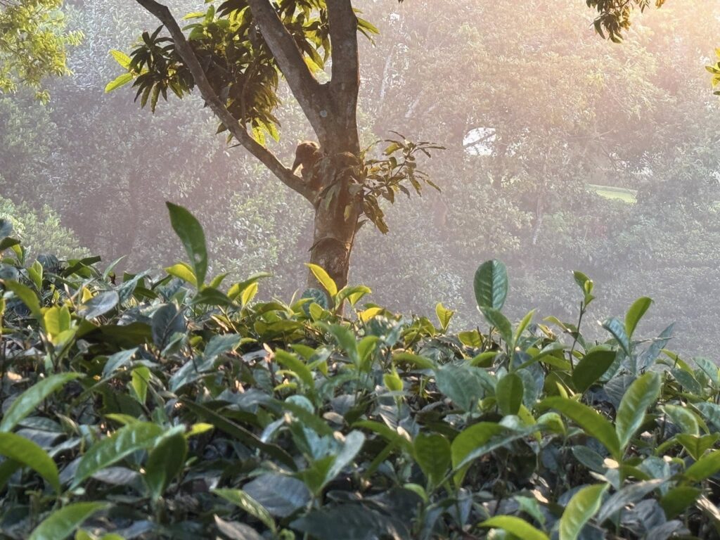 茶畑のシェイドツリーにそそぐ朝日。木々を飛び渡るサルたちにも後光がさして見えます。