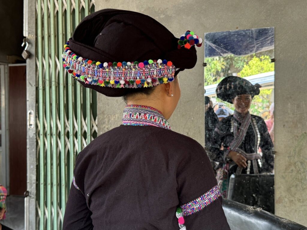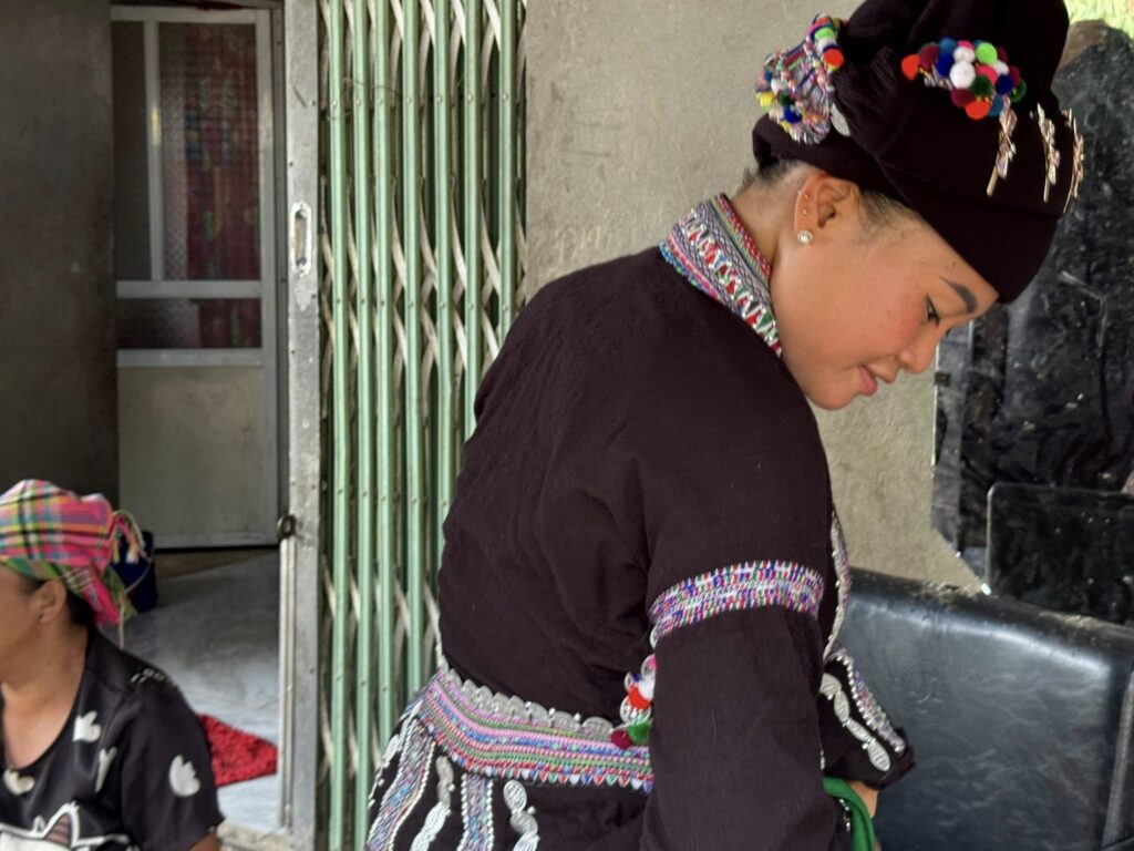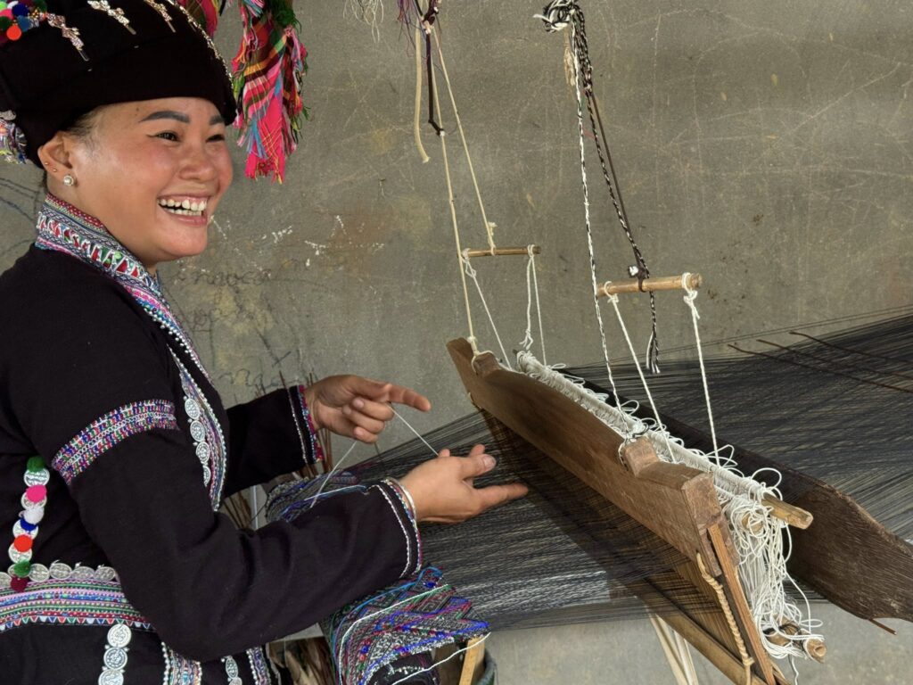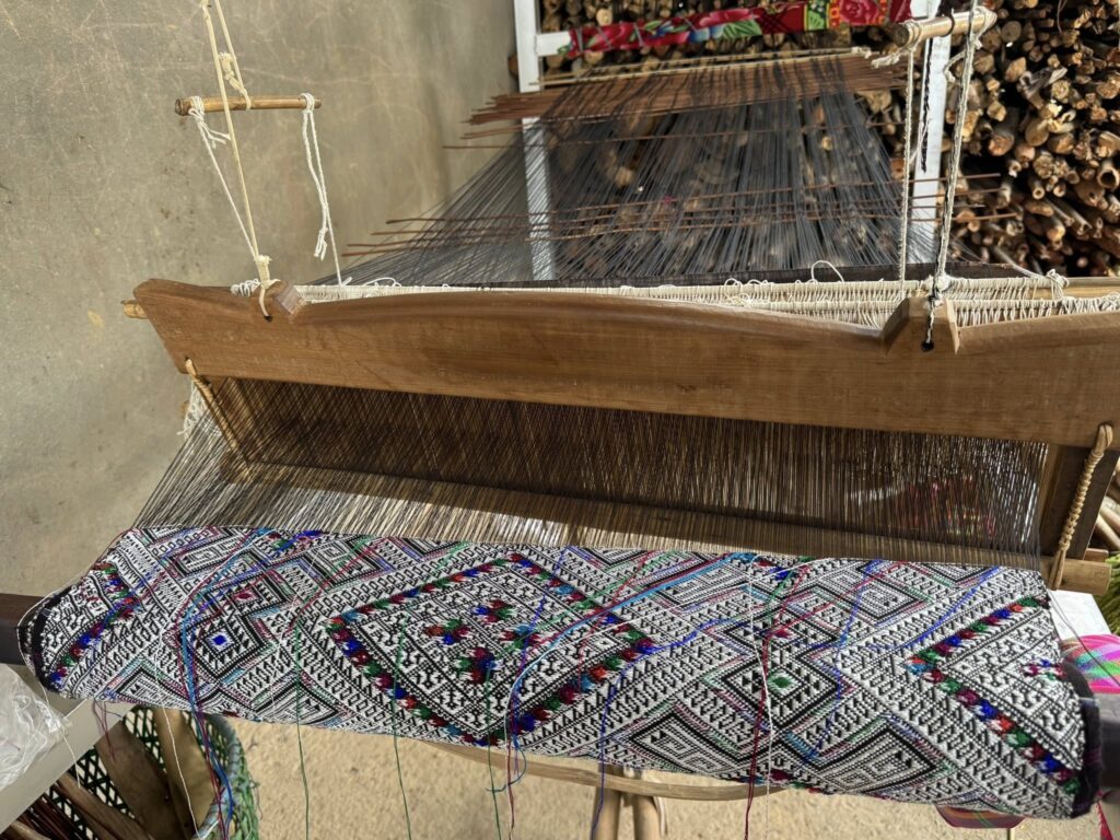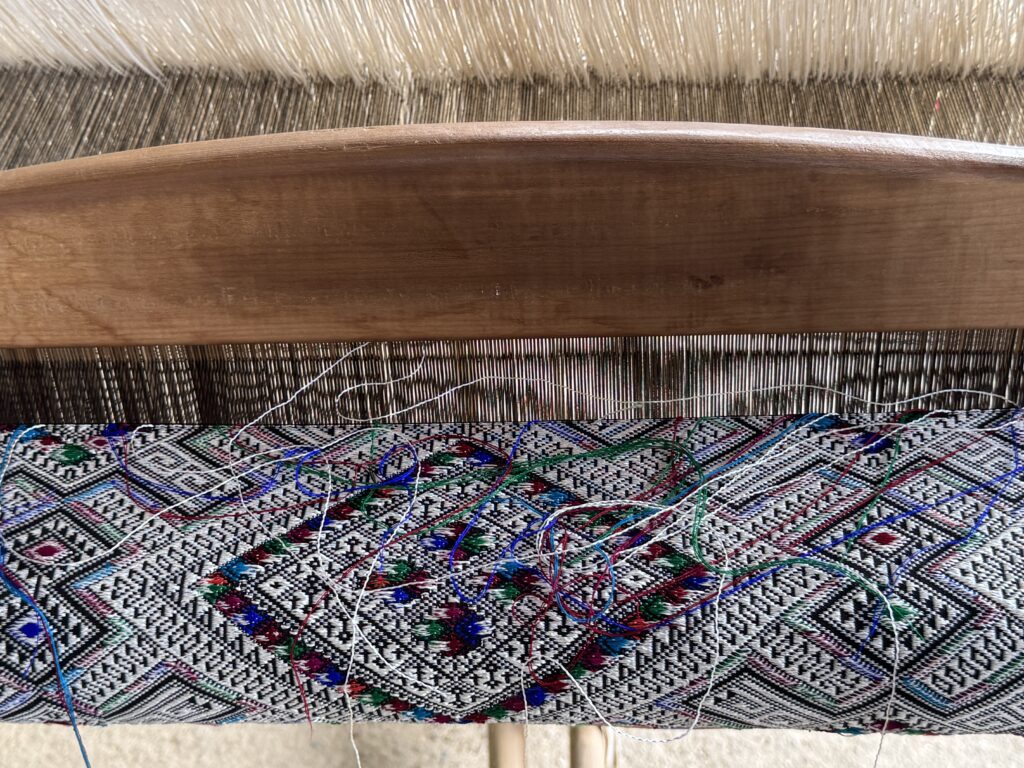 民族衣装を着て織って欲しいのお願いをかなえるべく、娘さんははにかみながら民族衣装に着替えて織りかけの生地を織ってくれたのでした。
