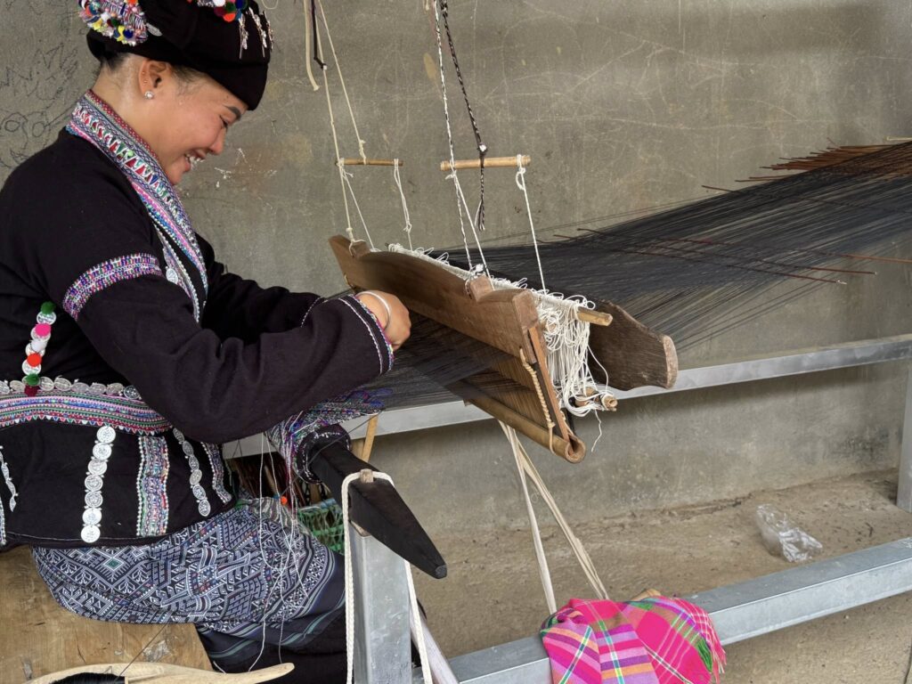 水車が回る黒タイ族の村を目指して農道を走っていたら、車窓から見かけた家の軒下で機織りしていた女性。