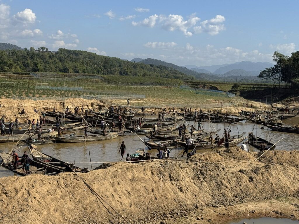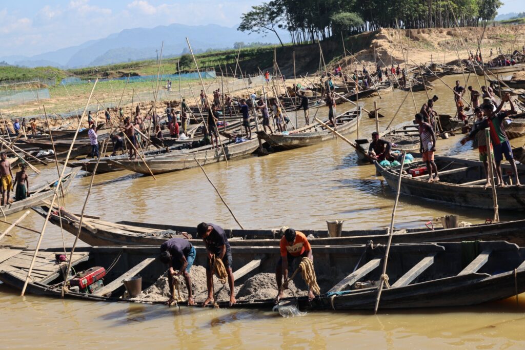 昔は川から石を採掘していた場所は石を取り尽くしてしまい、国内では規制されてしまい、代わりに、インドとの国境から石を運ぶトラックが列をなしています。川は、堆積した砂を採集する場所へと風景が様変わりしました。石を運べなくなった現在、岸辺でトントントントン舟を作り、作った舟を川に浮かべて水底の砂を金バケツですくって舟にあげる。採掘する物が石から砂に変わっただけで、やっている作業は変わっていませんでした。