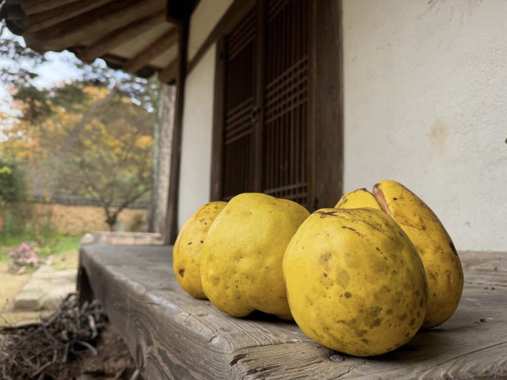 そんな国宝級の価値あるものを所蔵する緊張感ある建物から庭に出る、カリンと柿が実り、鳥たちがついばみに来ていました。