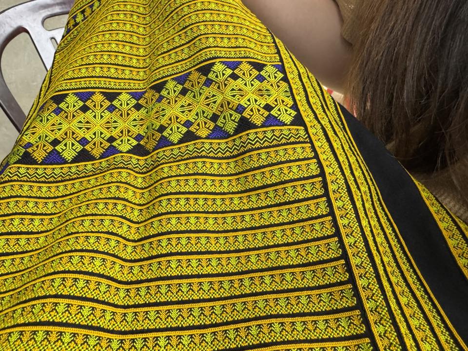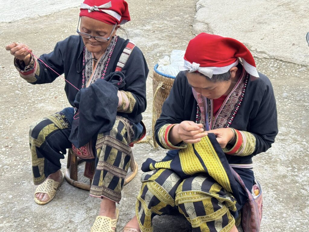 刺繍しながら販売しようとする商売上手な赤ザオ族の女性たちから逃れて村を歩いていると、民族衣装を着ていない若い女性が一人軒下で刺繍していました。お土産物とは異なり、発注者のこだわりを取り入れたもので、黄金シルクで刺繍していました。
