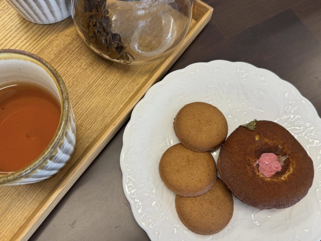 本日の茶菓子はスリランカ土産ジンジャービスケット、チキ、そして、梅月堂ぬれどら焼きプレミアムさくら。