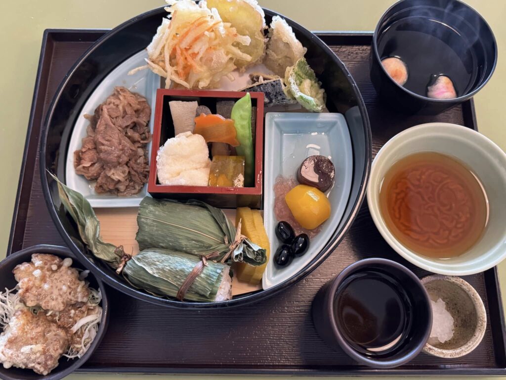 ここから7km歩いた先の市街地で満喫したランチは篠山城主青山家に伝わる家紋「無文銭」を模ったお弁当。郷土の味が詰まっていました^_^