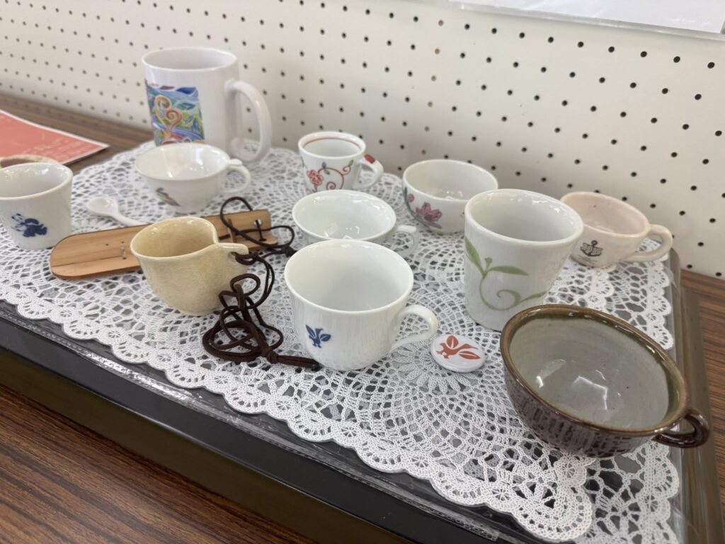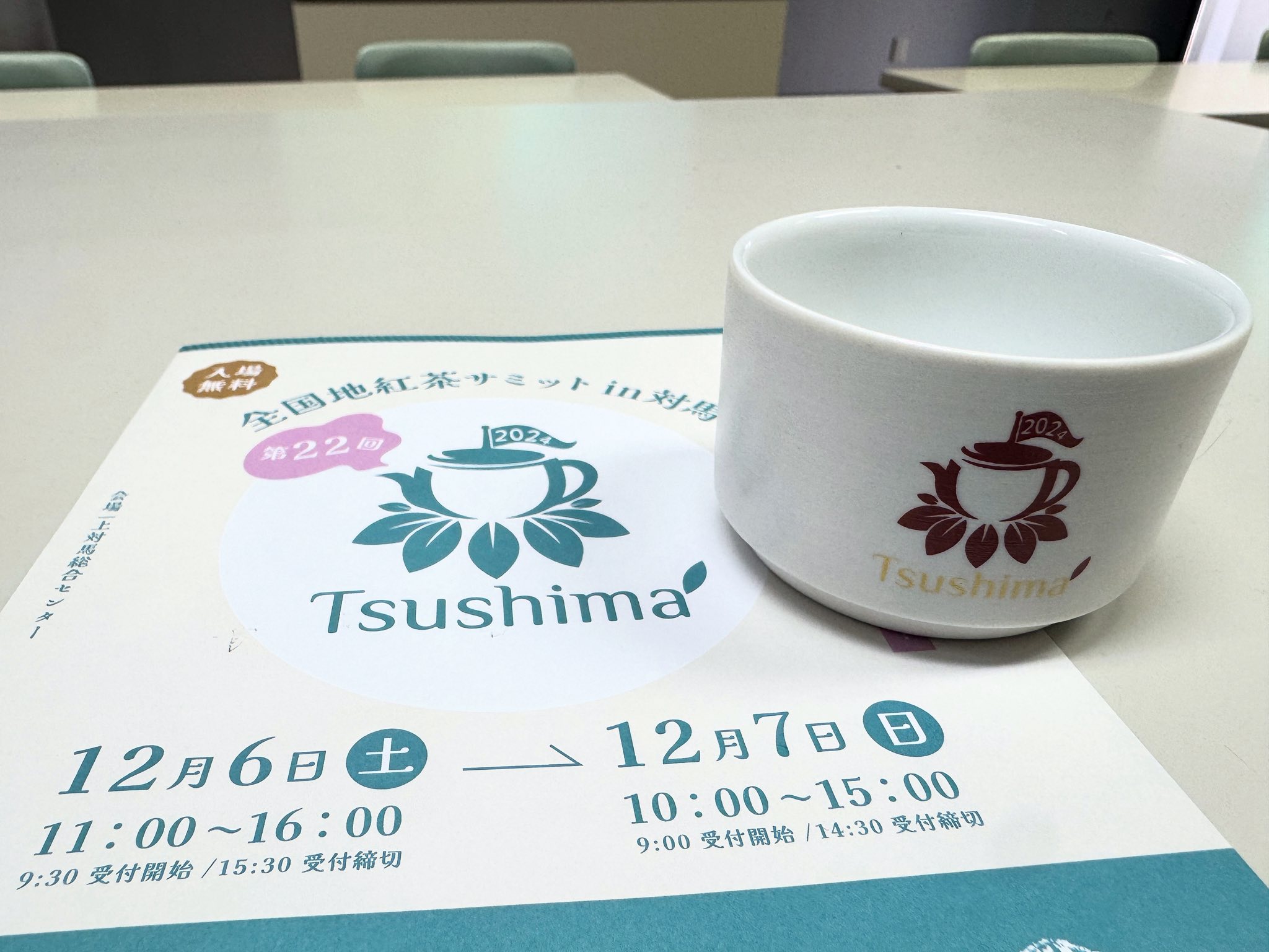 毎年地元の陶磁器産地で焼かれる記念カップ、対馬は対馬長石を用いた波佐見焼。開催テーマは地紅茶通信史。