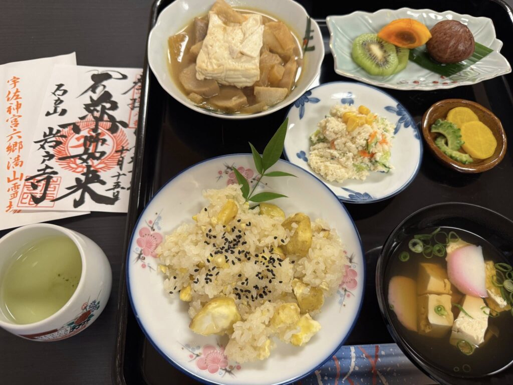 昔は修行僧が行き交ったであろう、仁聞菩薩の足跡を歩いて、お昼は石立山岩戸寺にて精進料理をいただきました。