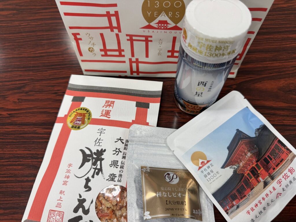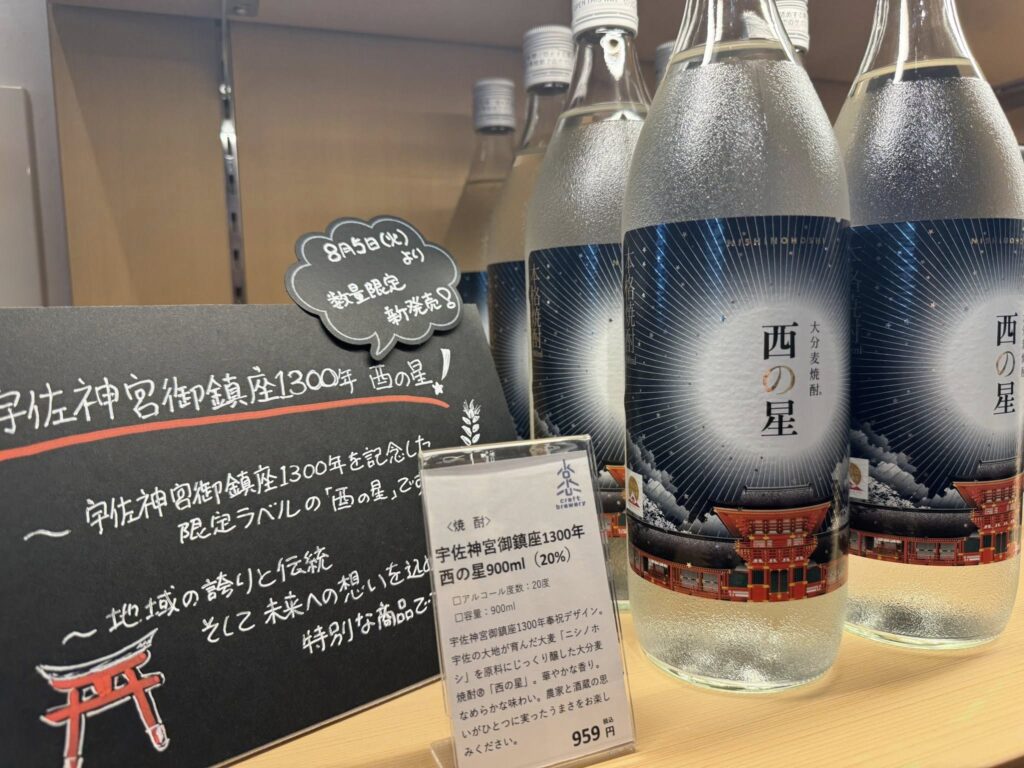 店内では宇佐神宮御鎮座1300年記念酒はスパークリングも。ちなみに、安倍晋三がプーチンにすすめたのが安心院のスパークリングワインだとか。こちらで販売するくろだまるの甘納豆は、お茶請けに良さそうです。