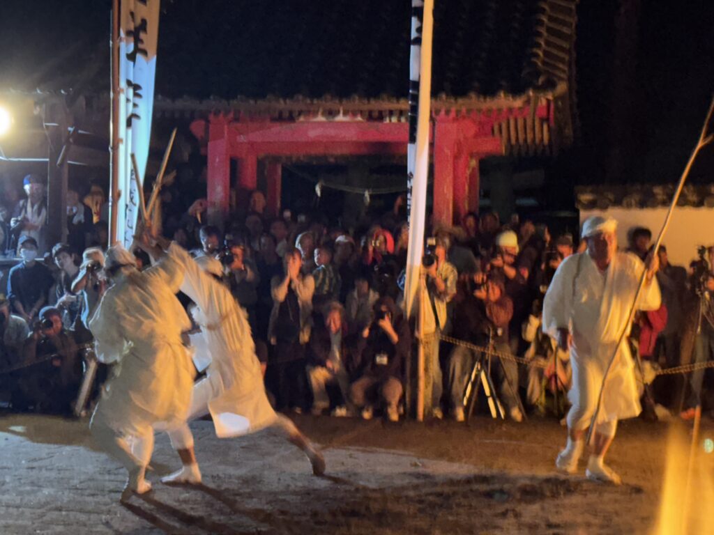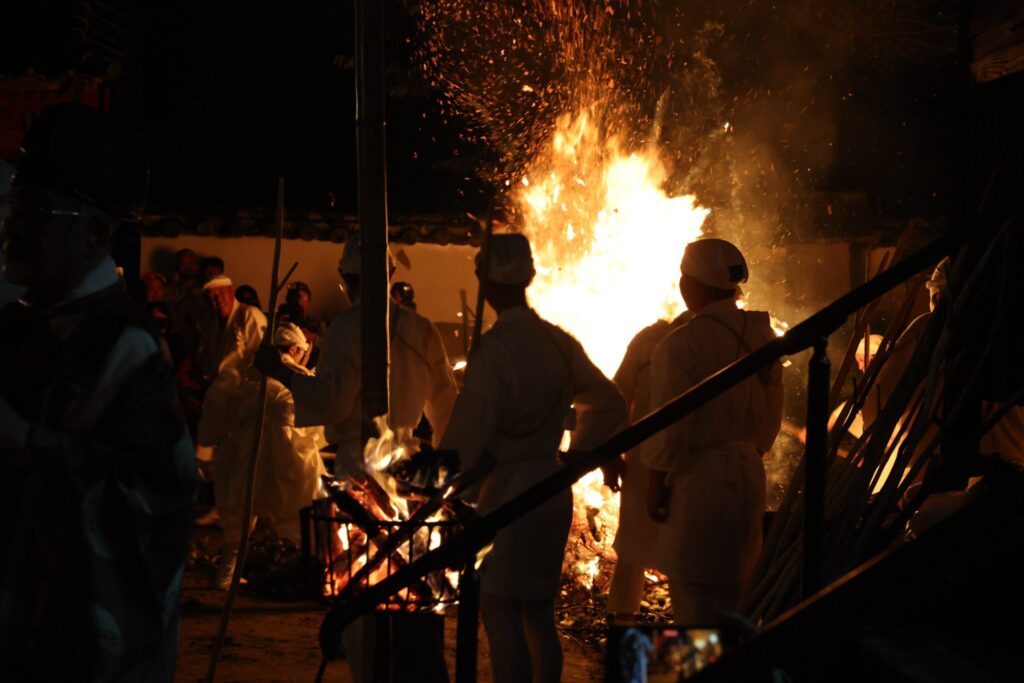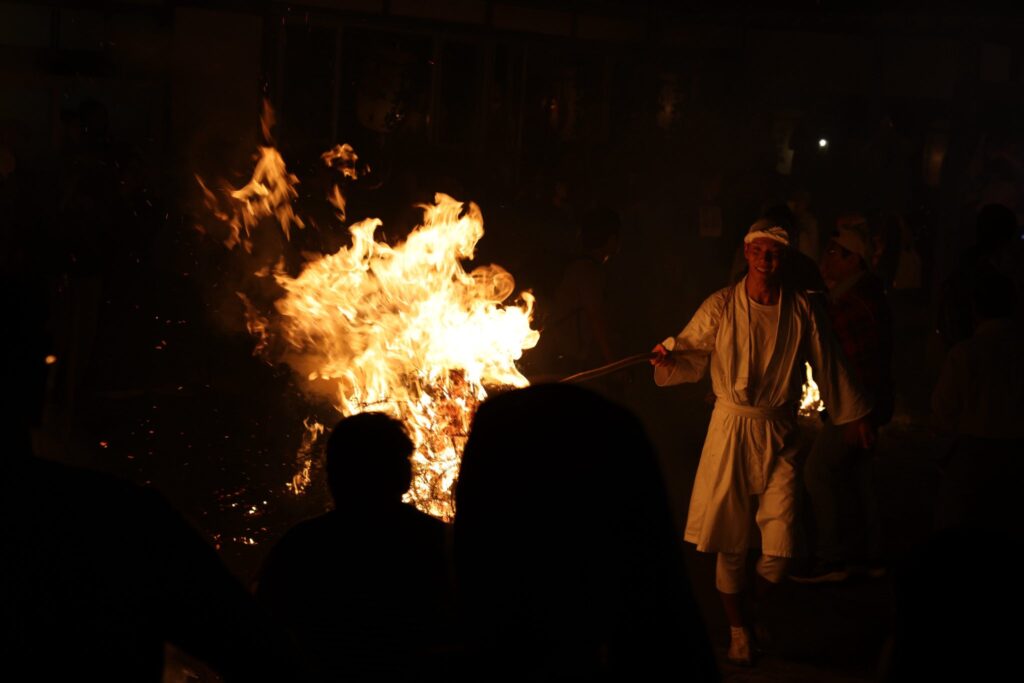 岩倉八幡社の境内に設けられた燃え盛るシダの山、境内をグルグル練り歩きながら、隙を見つけては何度も火の山に突入しようとするケベスどんとそれを阻止する山を守るトウバ。十回も突入すれば成功して、棒でシダの山をかき回し火の粉を散らすと、その後はトウバも一緒に火のついたシダを持って境内を走り回り、見学者に火の粉と煙を撒き散らします。この時、火の粉を浴びると無病息災になるといわれています^_^