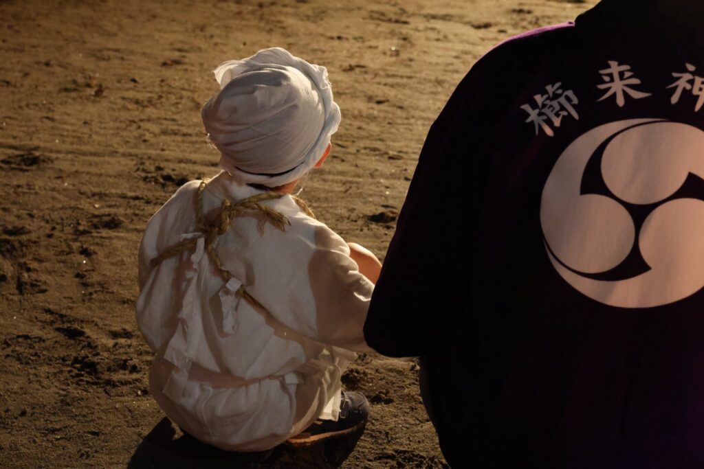 夕方海辺で精進潔斎して白装束に着替えた男性たちが祭りの中心で、なかでも面をつける一人のケベスどんが主役です。