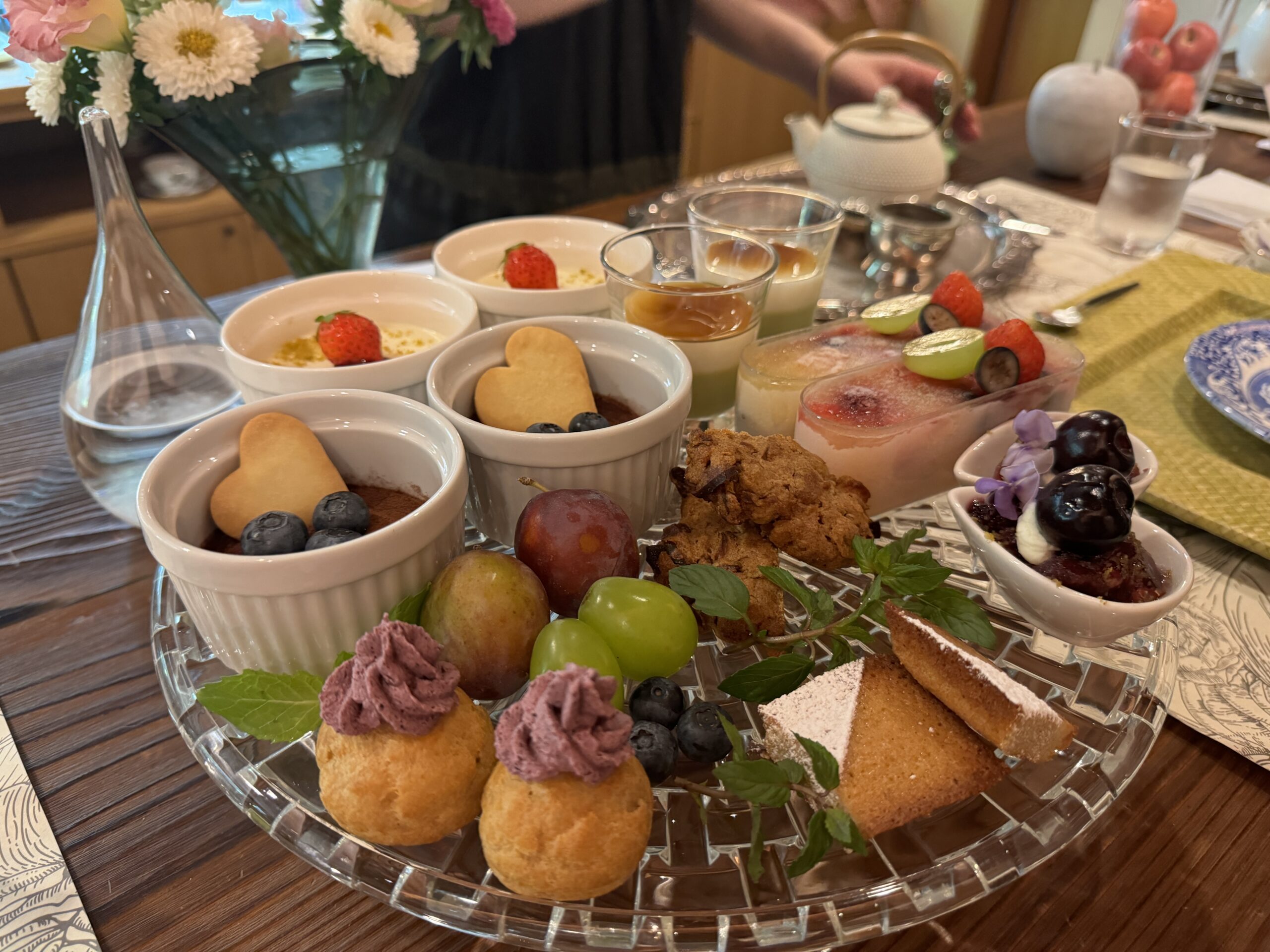 レアチーズケーキ/ベリーのタルト/フルーツソルベ/林檎ざくざくクッキー/抹茶とミルクのプリン/フィナンシェ/ミルクチョコレートムース/ブルーベリーのシュークリーム