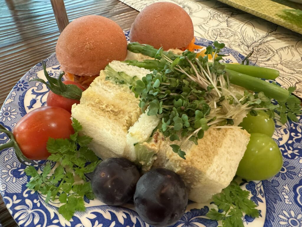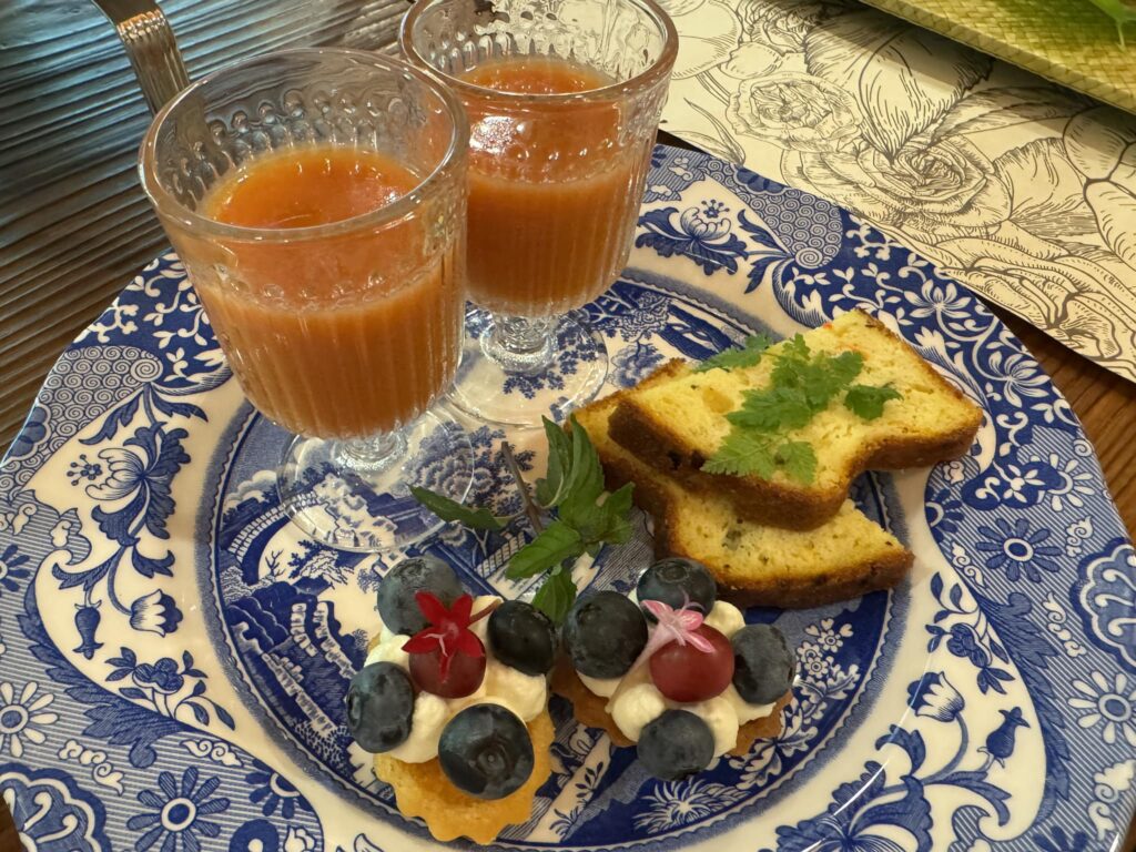 キャロットラペミニバーガー/きゅうりと卵のサンドイッチ/スコーン(アールグレイ&アップル)/トマトのガスパッチョ/ブルーベリータルト/ケークサクレ