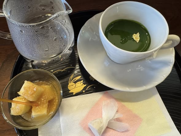 カップでいただく御濃茶は備前の昔。チェイサーの湯を加えて薄茶もありのスタイル。主菓子は季節の上生菓子またはオリジナルのメープルチーズ。