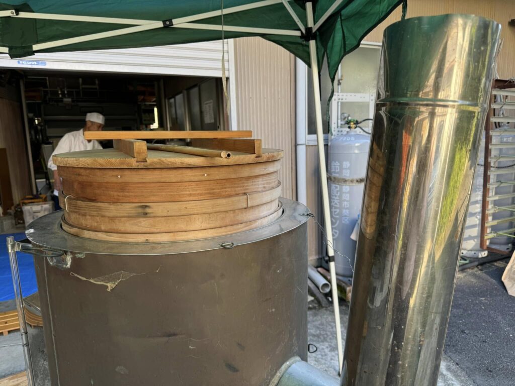 2日目、朝8時に撮った本日最初の画像は、森内茶農園の庭に据えられた蒸し器。