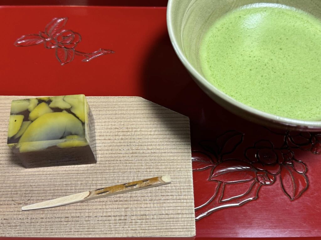 抹茶はもどりばし、生菓子は栗。お盆の村上木彫堆朱はお茶の花。秋が始まりました^_^