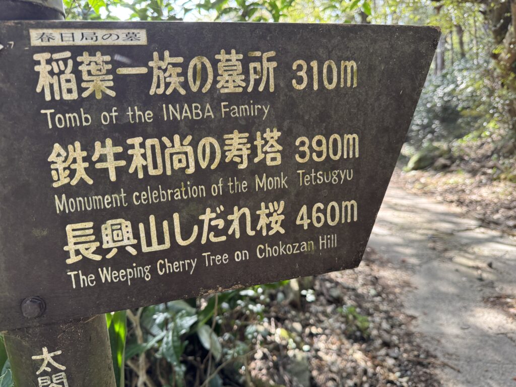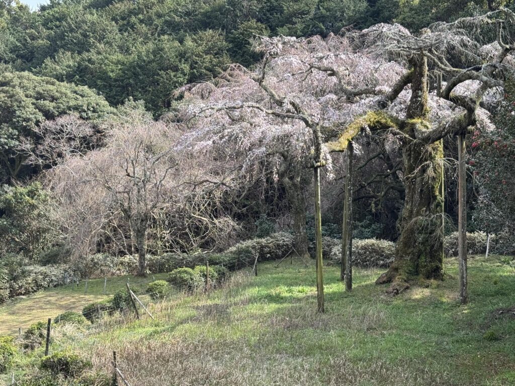 枝垂れ桜の足元には松蘿圃と刻まれた刻銘石がある。