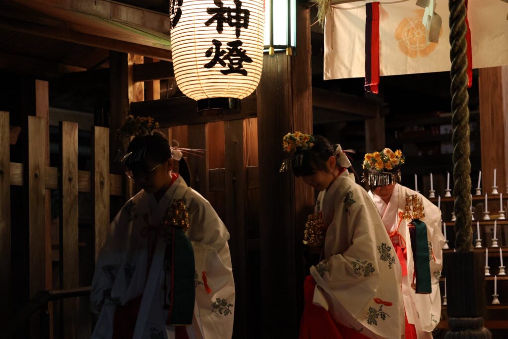 朝宮茶産地の氏神を祀る三所神社、参道に並ぶ木々の木陰に茶畑が繁茂して、7月には茶の収穫に感謝する献茶式も行われる場所。本殿両脇には7棟の苔むす瓦葺き屋根の建物が並び、7つの宮座(今座・大座・幣之座・孫座・親座・姫座・出ケ座)を構成する人々が各座の屋根の下集いました。
