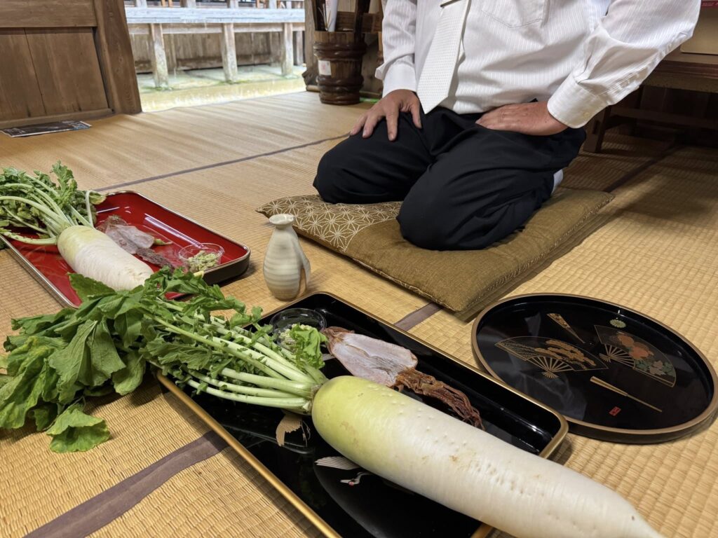 葉付き大根、するめ、くるみ牛蒡2組を膳に並べ、今年当屋が下座、来年当屋が上座に座って盃を交わして、当屋を引き継ぐ儀式を行います。