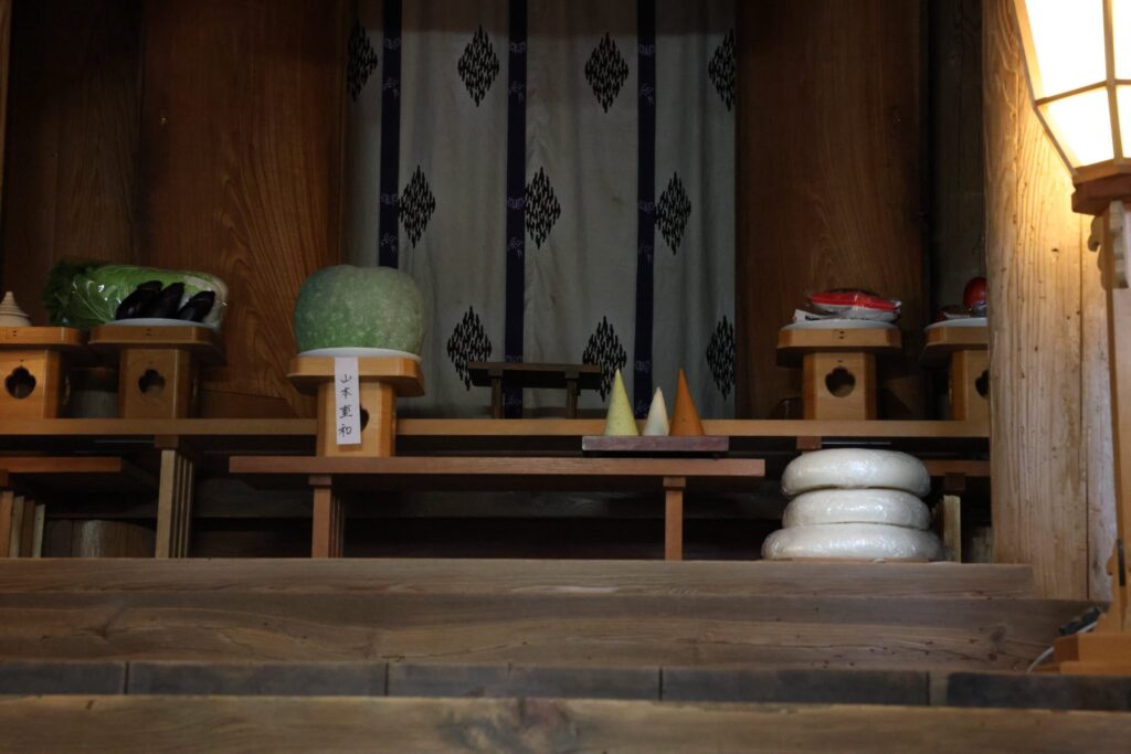 は円錐形三種の供物、三枚重ねの鏡餅は大餅当番の座の当屋が用意する-1024x683.jpg)