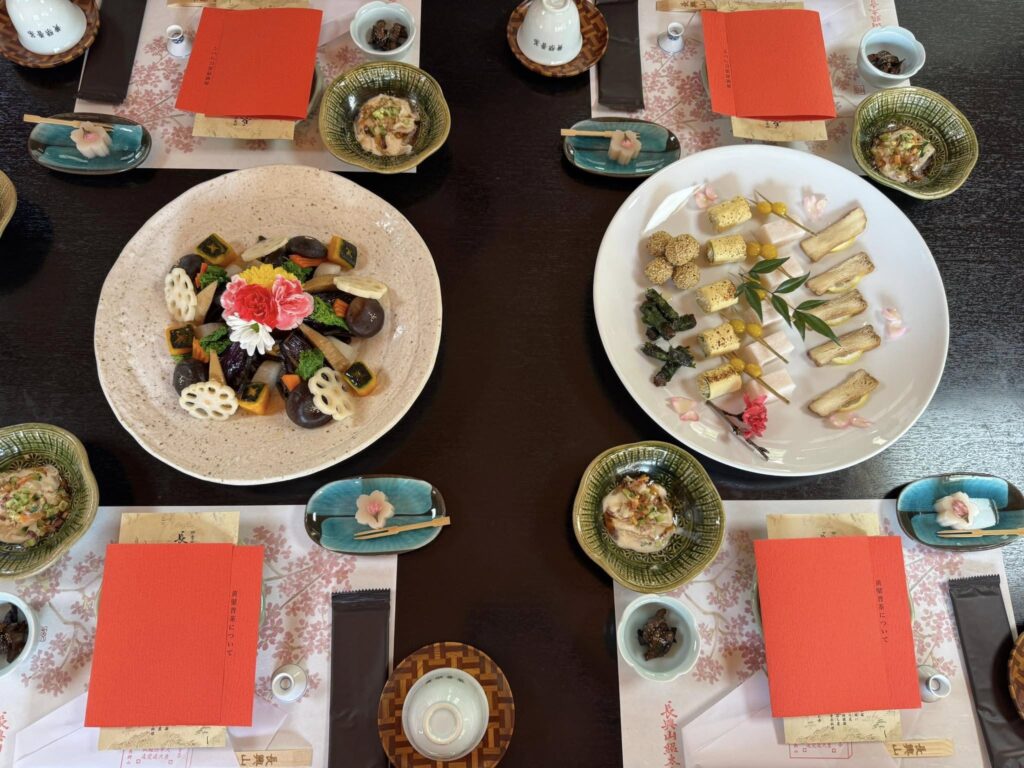 普茶とは、「普(あまね)く、大衆と茶を供にする」という意味の禅の言葉に由来しており、身分や立場で座る席を区別することなく、テーブルを囲む4人が平等に同じものを、仲良く和気あいあいとした雰囲気の中で、料理を残さずいただきます。