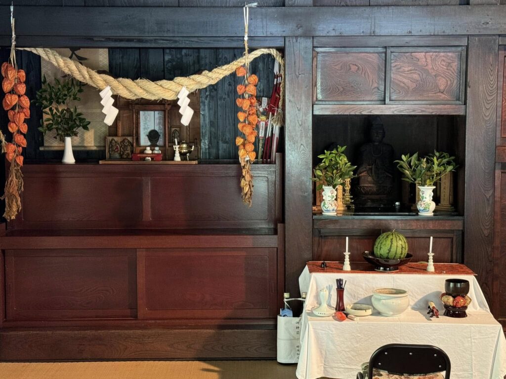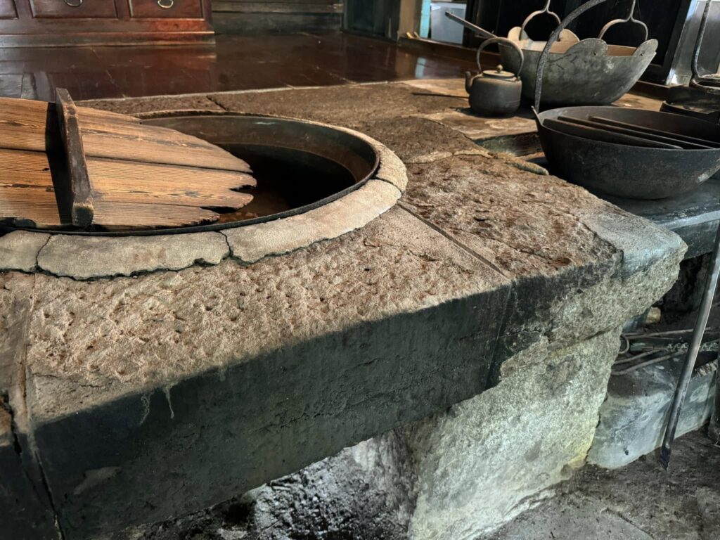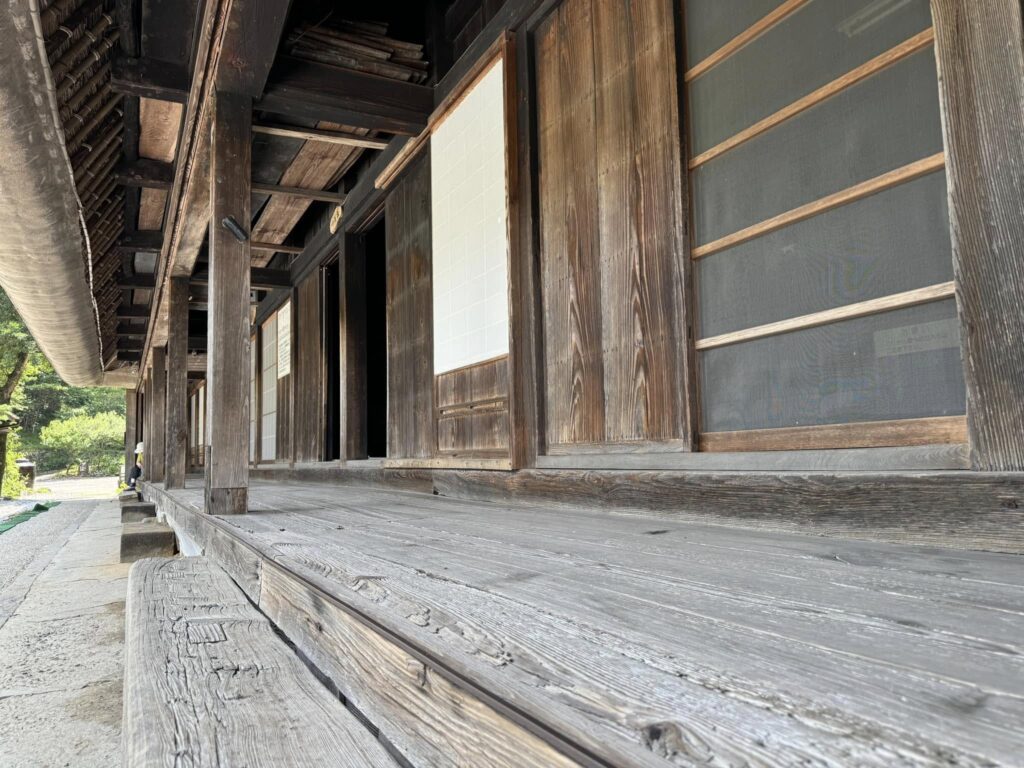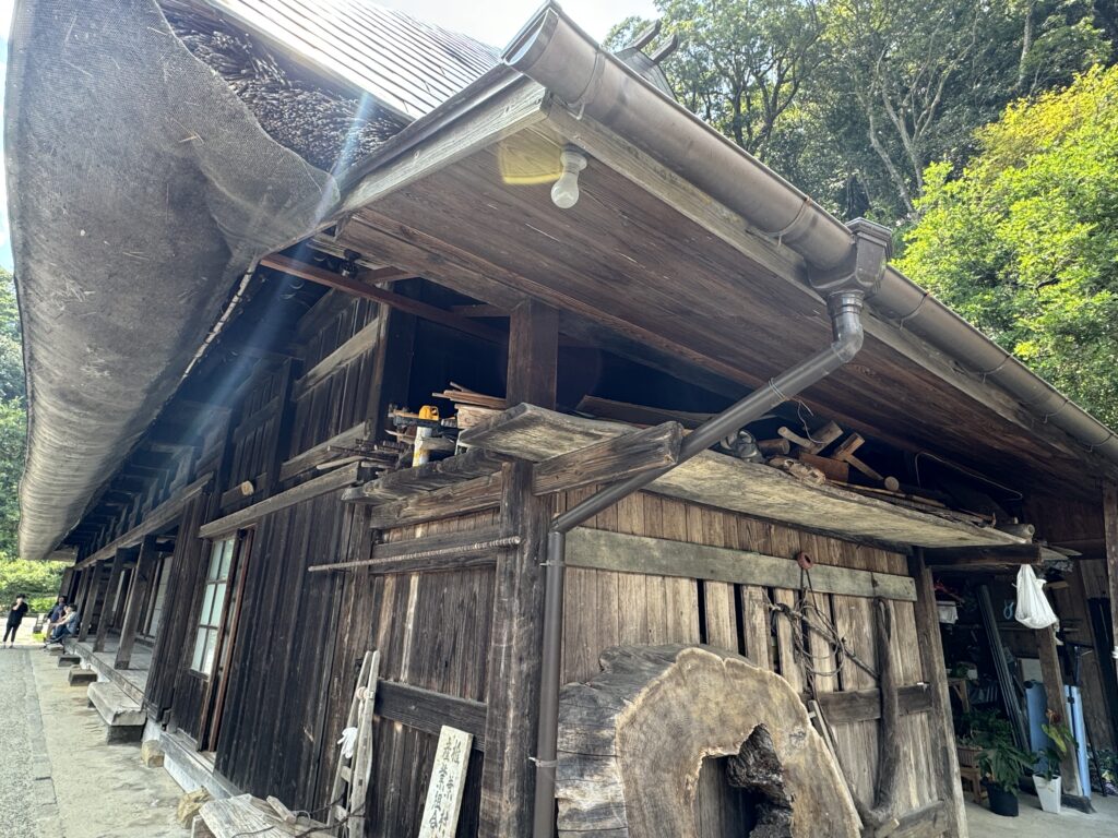 家屋は300年前に建てられたもので、出入り口から「どじ(土間)」「うちね(茶の間)」「つぼね(寝室、夫婦の部屋)」「でい(一番広い部屋・応接間・冠婚葬祭を行う間)」「こざ(神仏を祀る神聖な間、昔女子立入禁止だった)」が並列に一本の廊下と縁側で真っ直ぐつながっています。座ってお茶したくなる縁側では、京の平家言葉か、「たもりめせ=お召し上がり下さい」で、お茶を出しておもてなしした日常風景があったのです。