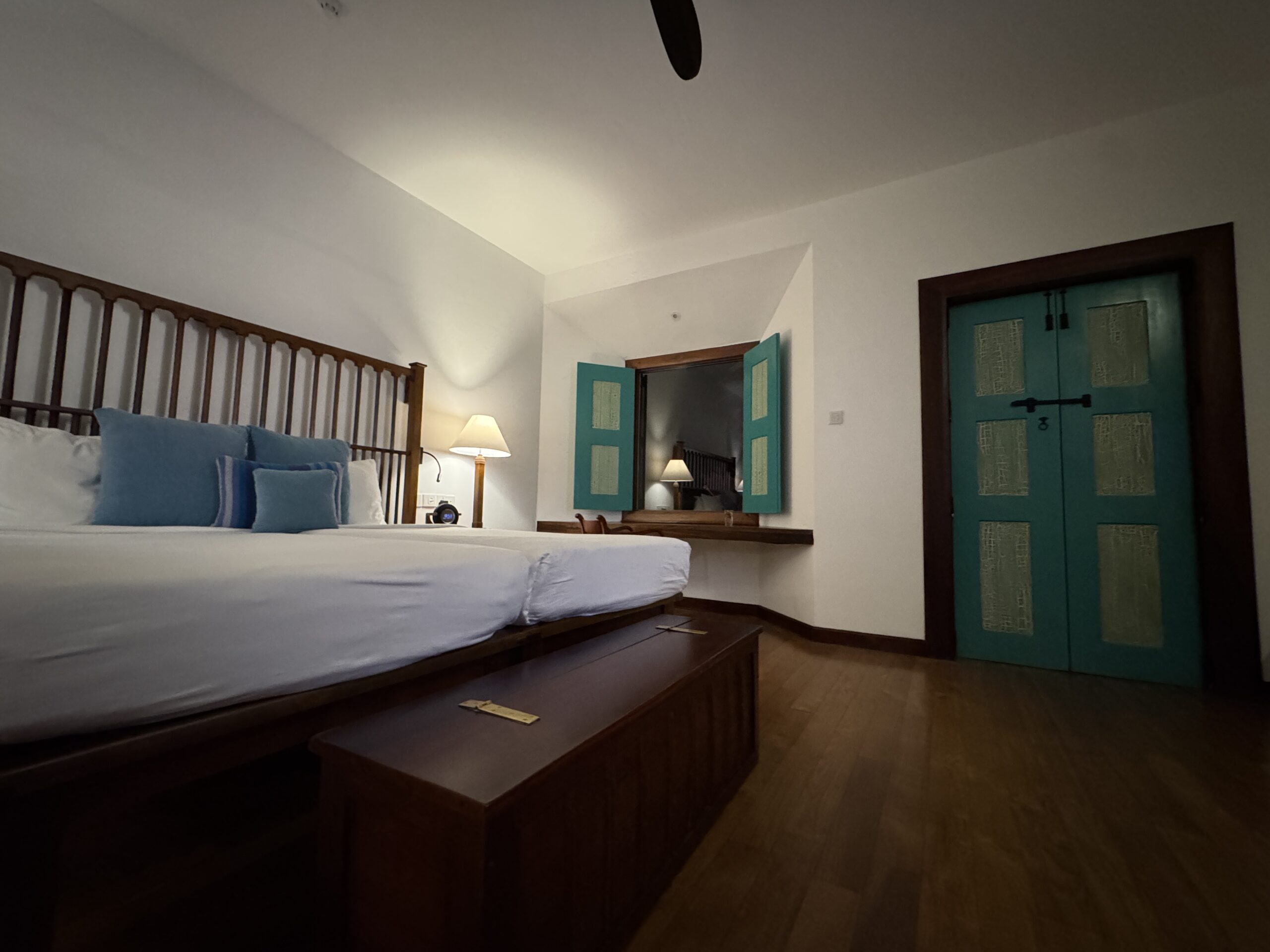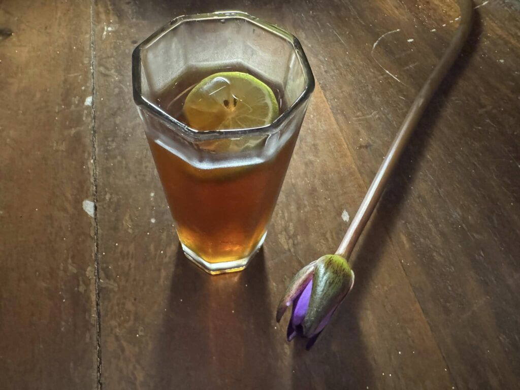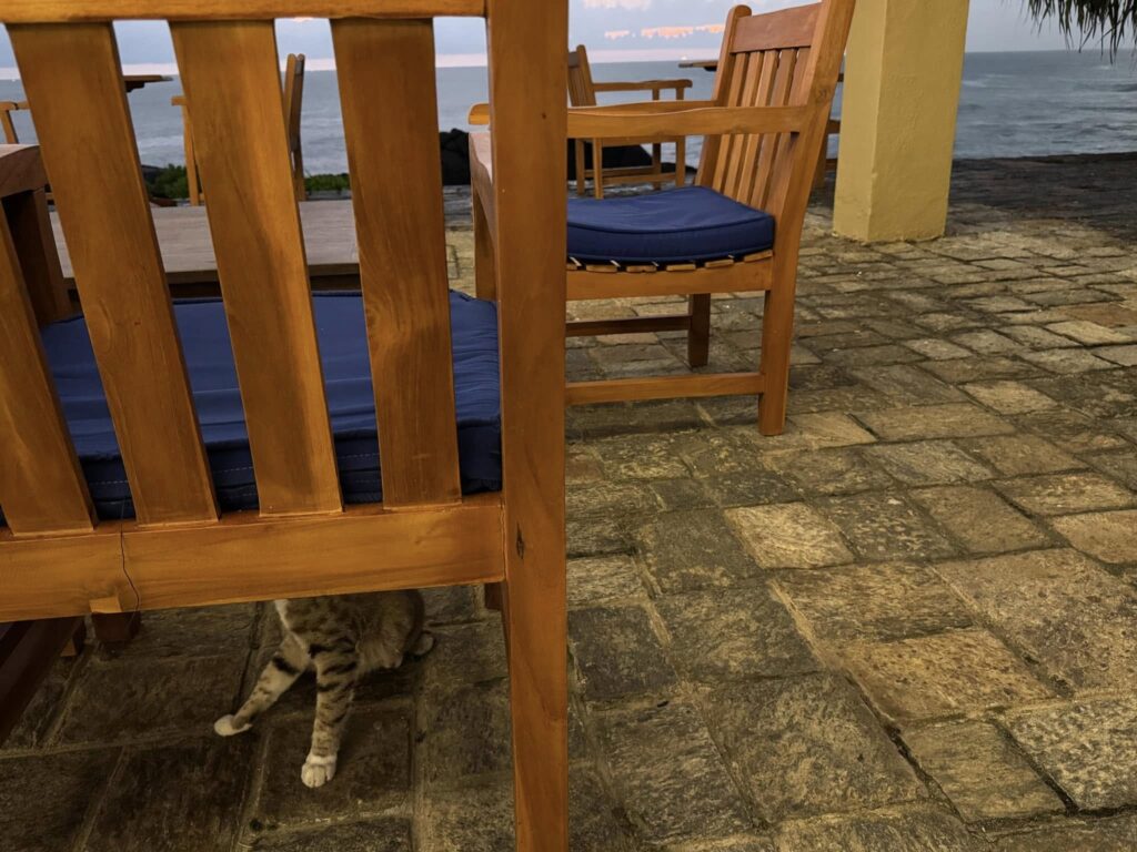 雷雨一過で海も空も暗く、椅子の下で動く猫の足をながめながら、ウェルカムティーをいただきました。