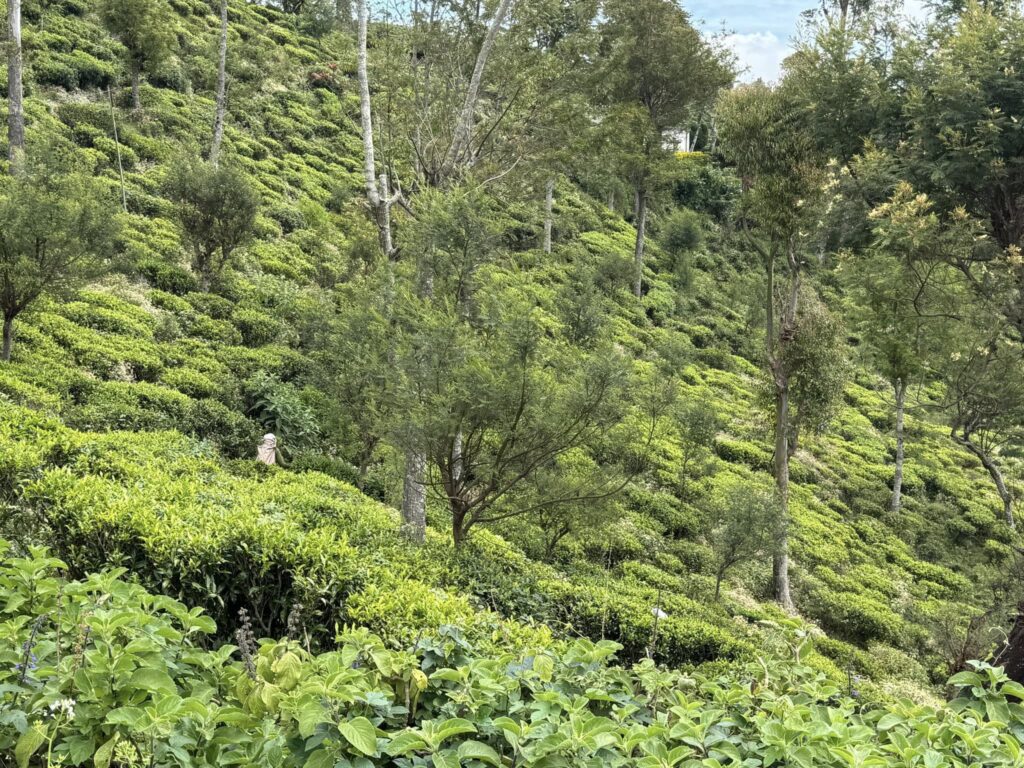 お茶摘みさんや、ヤギ、犬、牛、色々、お茶畑の斜面に隠れていました。