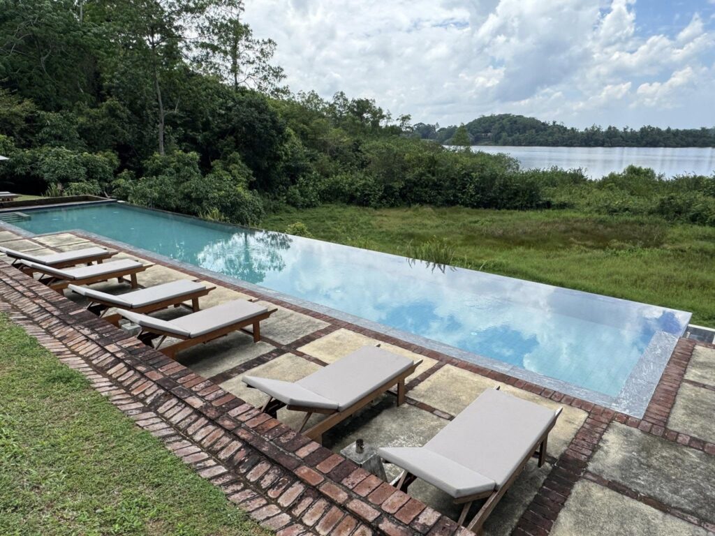 バワが朝食をとっていたテーブルからはシナモンヒル、その先の湖、さらにその先には緑の中に寺院の白い仏塔が見えます。