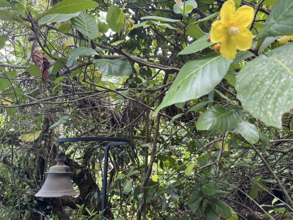 蝶々の形をした池ほとりに、朝の紅茶を知らせる鐘がありました。バワと仕事をともにした芸術家の作品も各所に見られます。ここで得たインスピレーションで数々の傑作が造られたのです。